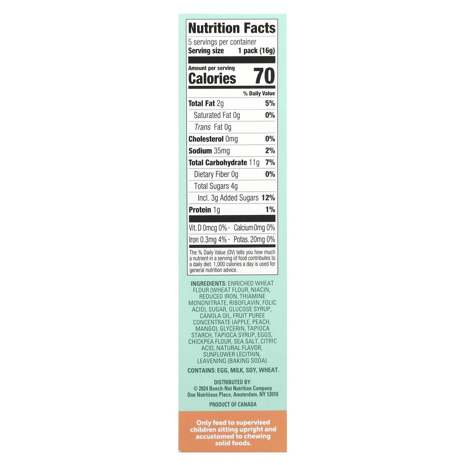 Обогащенная пшеничная мука (пшеничная мука, ниацин, восстановленное железо, тиамина мононитрат, рибофлавин, фолиевая кислота), сахара, глюкозный сироп, рапсовое масло, концентрат фруктового пюре (яблоко, персик, манго), глицерин, тапиоковый крахмал, тапиоковый сироп, яйца, нутовая мука, морская соль, лимонная кислота, натуральный ароматизатор, подсолнечный лецитин, разрыхлитель (пищевая сода).