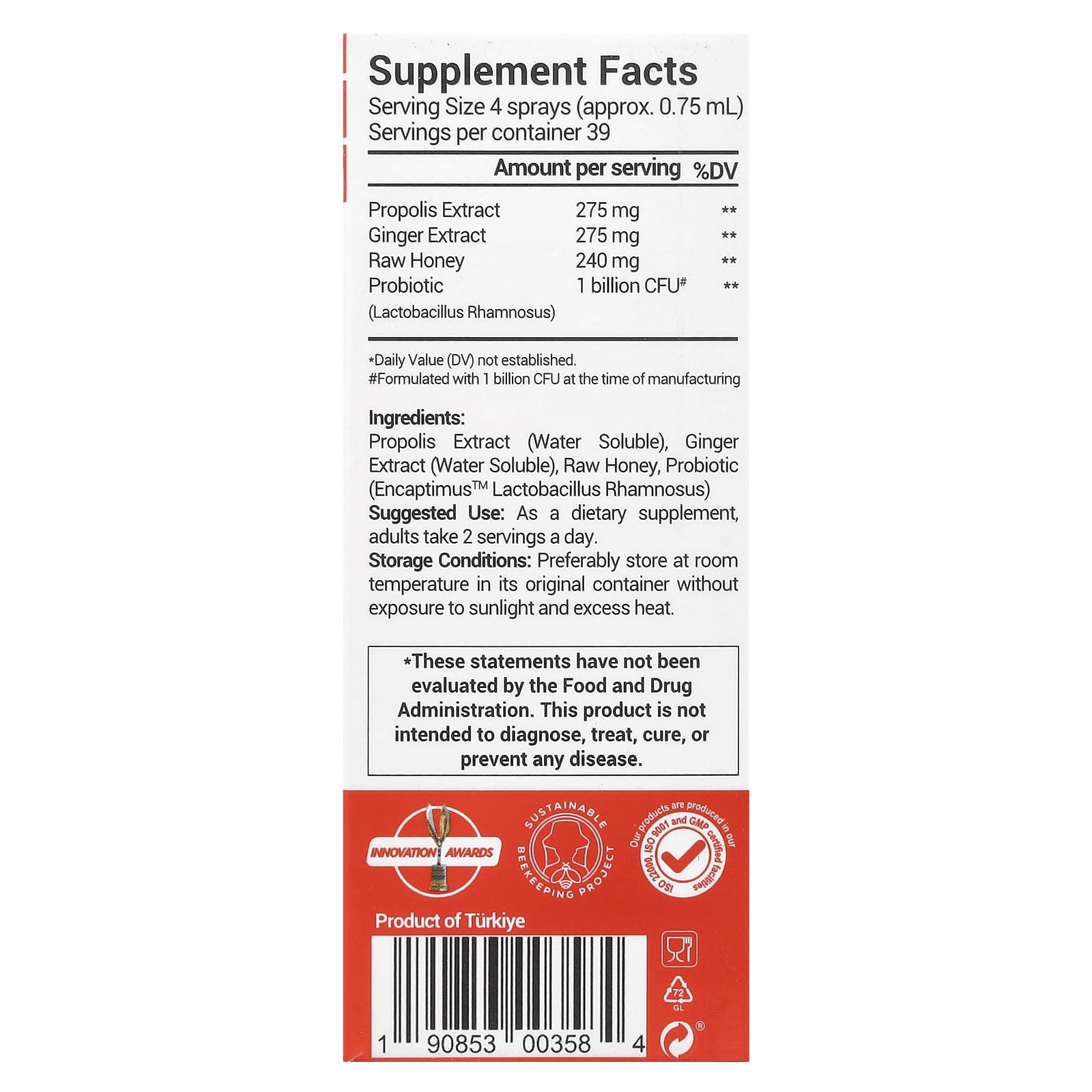 Экстракт прополиса (водорастворимый), экстракт имбиря (водорастворимый), сырой мед, пробиотик (Encaptimus ™ Lactobacillus Rhamnosus).