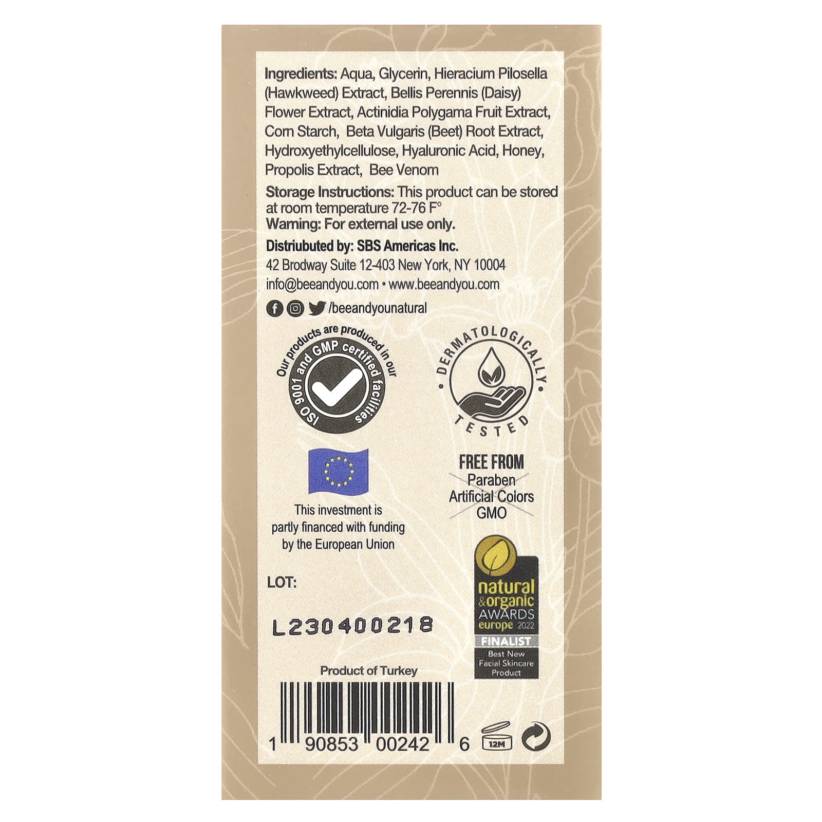 Вода, глицерин, экстракт ястреба (Hieracium pilosella), экстракт цветков маргаритки многолетней (Bellis perennis), экстракт плодов актинидии полигамы, кукурузный крахмал, экстракт корнеплода свеклы (Beta vulgaris), гидроксиэтилцеллюлоза, гиалуроновая кислота, мед, экстракт прополиса, пчелиный яд.