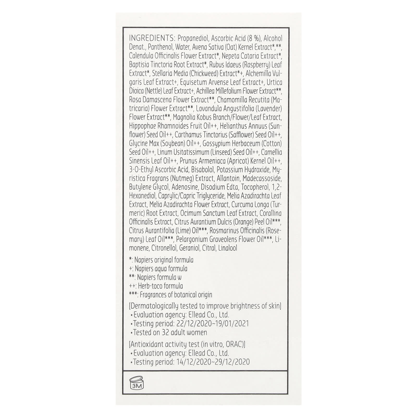 Пропандиол, аскорбиновая кислота (8%), спирт денат., пантенол, вода, экстракт ядер овса (Avena sativa) *, экстракт цветков календулы лекарственной *, экстракт непета катарии *, экстракт корня баптизии красильной *, экстракт листьев малины (Rubus idaeus) *, экстракт звездчатки (Stellaria media) * +, экстракт листьев алхемиллы (Alchemilla vulgaris), экстракт листьев хвоща полевого +, экстракт листьев крапивы двудомной, экстракт цветков ахиллеа тысячелистника **, экстракт цветков дамасской розы **, экстракт цветков ромашки (Chamomilla recutita) **, экстракт цветков лаванды (Lavandula angustifolia) **, Магнолия кобус ветка / экстракт цветов / листьев, масло плодов облепихи (hippophae rhamnoides), масло из семян подсолнечника (Helianthus annuus) ++, масло семян сафлора (Carthamus tinctorius) ++, глицин макс (соевое масло) ++, масло семян хлопчатника (Gossypium herbaceum) ++, льняное масло (Linum usitatissimum) ++, масло из листьев камелии китайской ++, масло из косточек абрикоса (Prunus armeniaca) ++, 3-0-этил аскорбиновая кислота, бисаболол, гидроксид калия, экстракт мускатного ореха (Myristica Fragrans), аллантоин, мадекассосид, бутиленгликоль, аденозин, двунатриевая эдта, токоферол, 1,2-гександиол, каприловый / каприновый триглицерид, экстракт листьев мелии азадирахты, экстракт цветков мелии азадирахты, экстракт корня куркумы (Curcuma longa), экстракт листьев священного (Ocimum sanctum), экстракт кораллины лекарственной, масло из цедры апельсина (Citrus aurantium dulcis) ***, масло лайма (Citrus aurantifolia) ***, масло из листьев розмарина (Rosmarinus officinalis) ***, масло из цветков пеларгонии (Pelargonium graveolens) ***, лимонен, цитронеллол, гераниол, цитраль, линалоол.