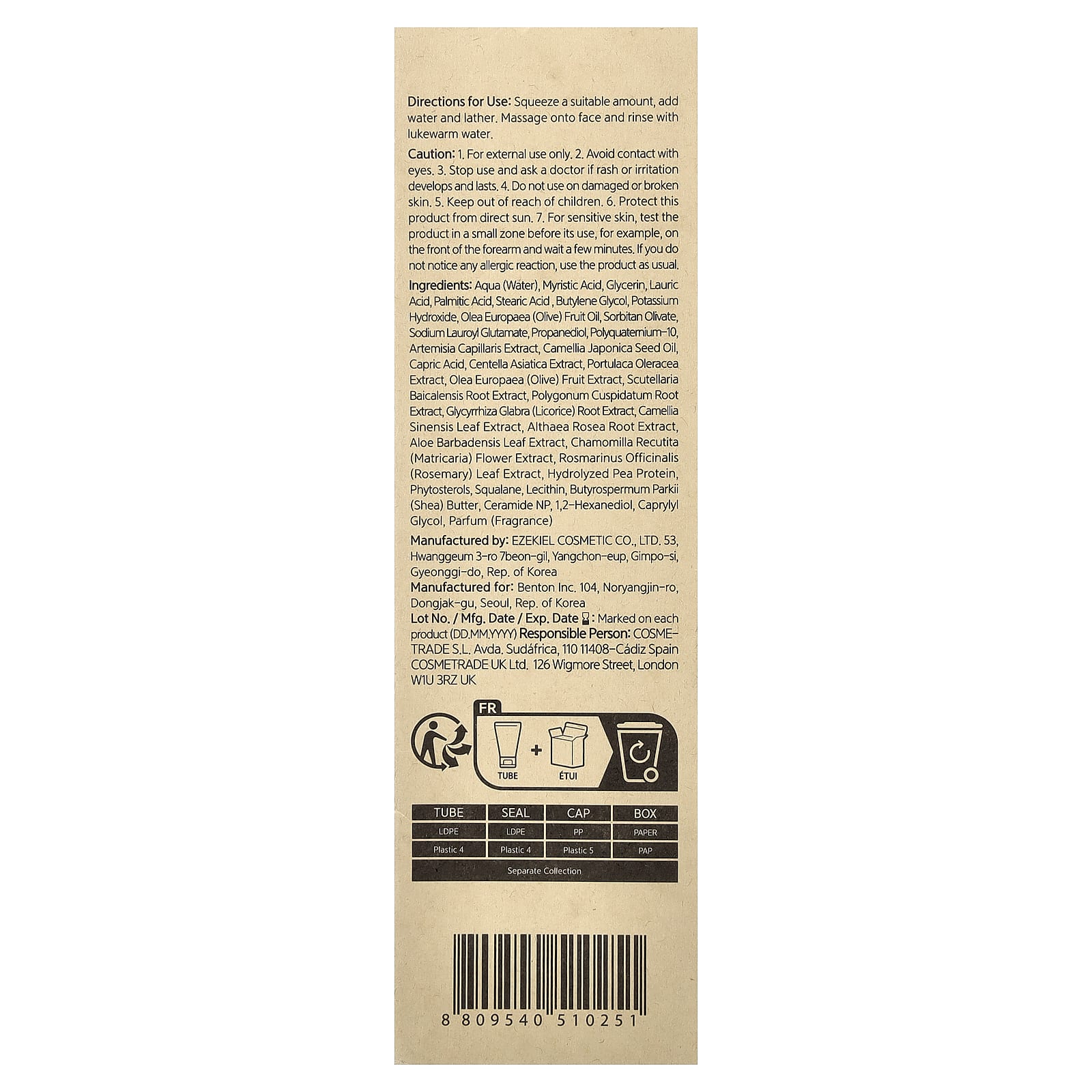 Вода, миристиновая кислота, глицерин, Лауриновая кислота, пальмитиновая кислота, стеариновая кислота , бутиленгликоль, едкое кали, Оливковое масло, сорбитан оливат, Лауроил глутамат натрия, пропандиол, поликватерниум-10, экстракт полыни волосовидной (Artemisia capillaris), масло из семян камелии японской (Camellia japonica), каприновая кислота, Экстракт центеллы азиатской, экстракт портулака огородного, экстракт оливкового дерева (Оlea europaea), экстракт корня шлемника (Scutellaria baicalensis), экстракт корня рейнутрии японской (Polygonum cuspidatum), Экстракт корня солодки, Экстракт листьев камелии китайской, экстракт корня штокрозы розовой (Althaea rosea), Экстракт листьев алоэ барбаденсис, Chamomilla recutita (Matricaria) Экстракт цветков, Экстракт листьев розмарина, гидролизованный гороховый белок, фитостеролы, сквалан, лецитин, Масло Butyrospermum parkii (Ши), Керамид NP, 1,2-гександиол, каприлилгликоль, парфюмерная композиция (отдушка).