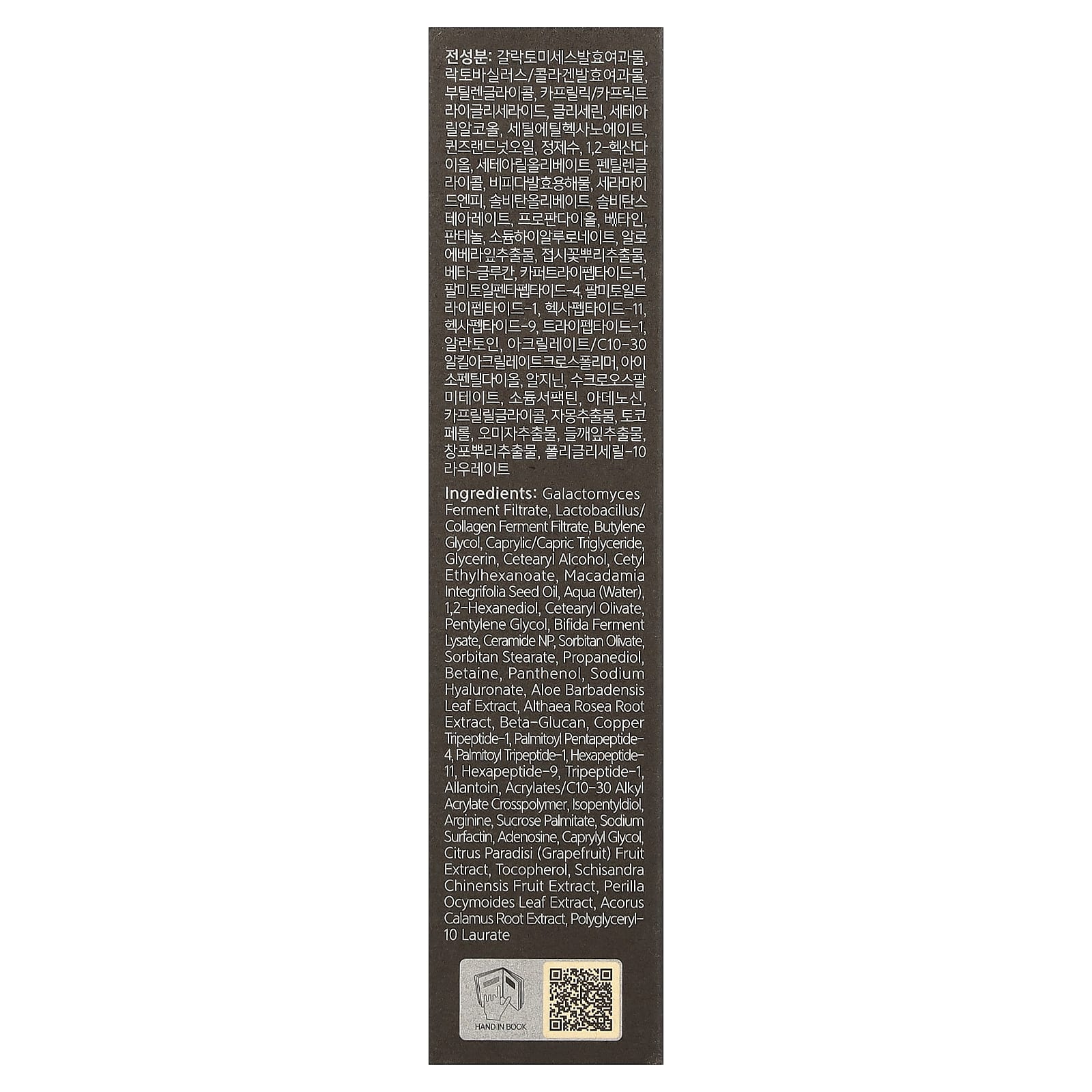 Фильтрат продукта ферментации галактомицетов, фильтрат продукта ферментации коллагена с лактобактериями, бутиленгликоль, каприловый/каприновый триглицерид, глицерин, цетеариловый спирт, цетилэтилгексаноат, масло макадамии (Macadamia integrifolia), вода (Aqua), 1,2-гександиол, цетеарил оливат, пентилен гликоль, лизат ферментов бифидобактерий, керамид NP, сорбитан оливат, сорбитан стеарат, пропандиол, бетаин, пантенол, гиалуронат натрия, экстракт листьев алоэ вера (Aloe barbadensis), экстракт корня штокрозы розовой (Althaea rosea), бета-глюкан, меди трипептид-1, пальмитоил пентапептид-4, пальмитоил трипептид-1, гексапептид-11, гексапептид-9, трипептид-1, аллантоин, акрилат/c10-30 алкил акрилат кроссполимер, изопентилдиол, аргинин, пальмитат сахарозы, сурфактин натрия, аденозин, каприлилгликоль, экстракт плодов грейпфрута (Citrus paradisi), токоферол, экстракт плодов лимонника (Schisandra chinensis), экстракт листьев периллы (Perilla ocymoides), экстракт корня аира (Acorus calamus), полиглицерил-10 лаурат.