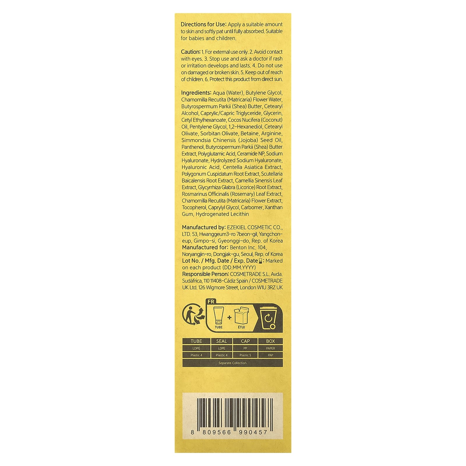 Вода, бутиленгликоль, вода из цветков ромашки (Chamomilla recutita), масло ши (Butyrospermum parkii), цетеариловый спирт, каприловый/каприновый триглицерид, глицерин, цетил этилгексаноат, кокосовое масло (Cocos nucifera), пентилен гликоль, 1,2-гександиол, цетеарил оливат, сорбитан оливат, бетаин, аргинин, масло семян жожоба (Simmondsia chinensis), пантенол, экстракт масла ши (Butyrospermum parkii), полиглутаминовая кислота, керамид NP, гиалуронат натрия, гидролизованный гиалуронат натрия, Гиалуроновая кислота, экстракт готу колы (Centella asiatica), экстракт корня рейнутрии японской (Polygonum cuspidatum), экстракт корня шлемника (Scutellaria baicalensis), экстракт листьев зеленого чая (Camellia sinensis), экстракт корня солодки (Glycyrrhiza glabra), экстракт листьев розмарина (Rosmarinus officinalis), экстракт цветков ромашки (Chamomilla recutita), токоферол, каприлилгликоль, карбомер, ксантановая камедь, гидрогенизированный лецитин.