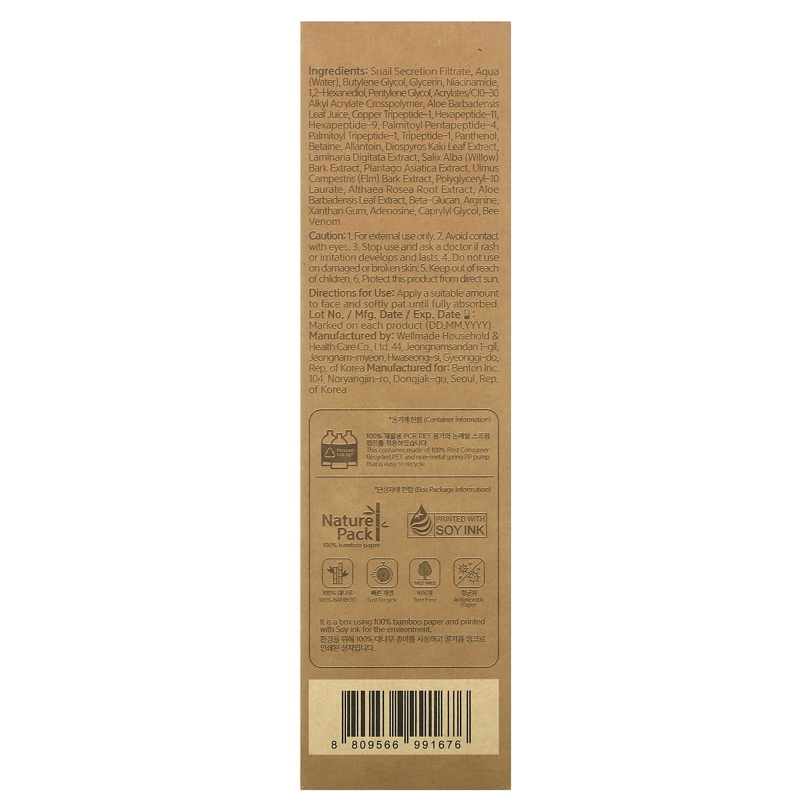 Фильтрат секрета улитки, вода (Aqua), бутиленгликоль, глицерин, никотинамид, 1,2-гександиол, пентилен гликоль, акрилат/c10-30 алкил акрилат кроссполимер, сок из листьев алоэ вера (Aloe barbadensis), трипептид меди-1, гексапептид-11, гексапептид-9, пальмитоил пентапептид-4, пальмитоил трипептид-1, трипептид-1, пантенол, бетаин, аллантоин, экстракт листьев хурмы восточной (Diospyros kaki), экстракт ламинарии пальчаторассеченной (Laminaria digitata), экстракт коры ивы (Salix alba), экстракт подорожника азиатского (Plantago asiatica), экстракт коры вяза (Ulmus campestris), полиглицерил-10 лаурат, экстракт корня штокрозы розовой (Althaea rosea), экстракт листьев алоэ вера (Aloe barbadensis), бета-глюкан, аргинин, ксантановая камедь, аденозин, каприлилгликоль, пчелиный яд.