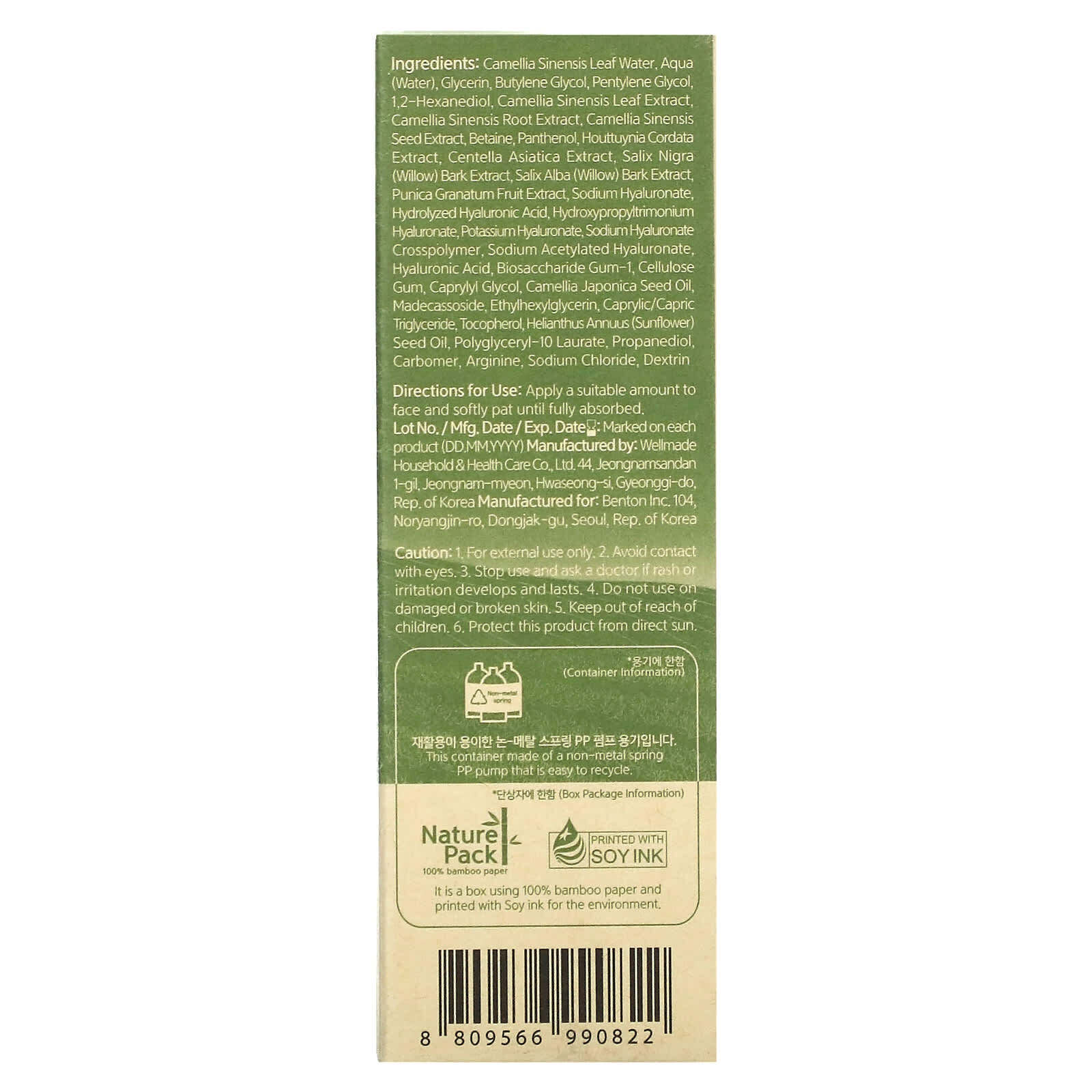 Вода из листьев зеленого чая (Camellia sinensis), вода (Aqua), глицерин, бутиленгликоль, пентилен гликоль, 1,2-гександиол, экстракт листьев зеленого чая (Camellia sinensis), экстракт корня зеленого чая (Camellia sinensis), экстракт семян зеленого чая (Camellia sinensis), бетаин, пантенол, экстракт хауттюйнии сердцевидной (Houttuynia cordata), экстракт готу колы (Centella asiatica), экстракт коры черной ивы (Salix nigra), экстракт коры ивы (Salix alba), экстракт плодов граната (Punica granatum), гиалуронат натрия, гидролизованная гиалуроновая кислота, гиалуронат гидроксипропилтримония, гиалуронат калия, кроссполимер гиалуроната натрия, ацетилированный гиалуронат натрия, гиалуроновая кислота, биосахаридная смола-1, целлюлозная камедь, каприлилгликоль, масло из семян камелии японской (Camellia japonica), мадекассосид, этилгексилглицерин, каприловый/каприновый триглицерид, токоферол, подсолнечное масло (Helianthus annuus), полиглицерил-10 лаурат, пропандиол, карбомер, аргинин, хлорид натрия, декстрин.