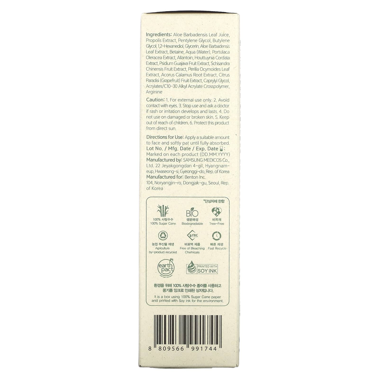 Сок листьев алоэ вера, экстракт прополиса, пентилен гликоль, бутиленгликоль, 1,2-гександиол, глицерин, экстракт листьев алоэ вера (Aloe barbadensis), бетаин, вода, экстракт портулака огородного (Portulaca oleracea), аллантоин, экстракт хауттюйнии сердцевидной (Houttuynia cordata), экстракт плодов гуавы (Psidium guajava), экстракт плодов лимонника китайского (Schizandra chinensis), экстракт листьев периллы (Perilla ocymoides), экстракт корня аира (Acorus calamus), экстракт плодов грейпфрута (Citrus paradisi), каприлилгликоль, кроссполимер акрилатов / С10-30 алкилакрилатов, аргинин.