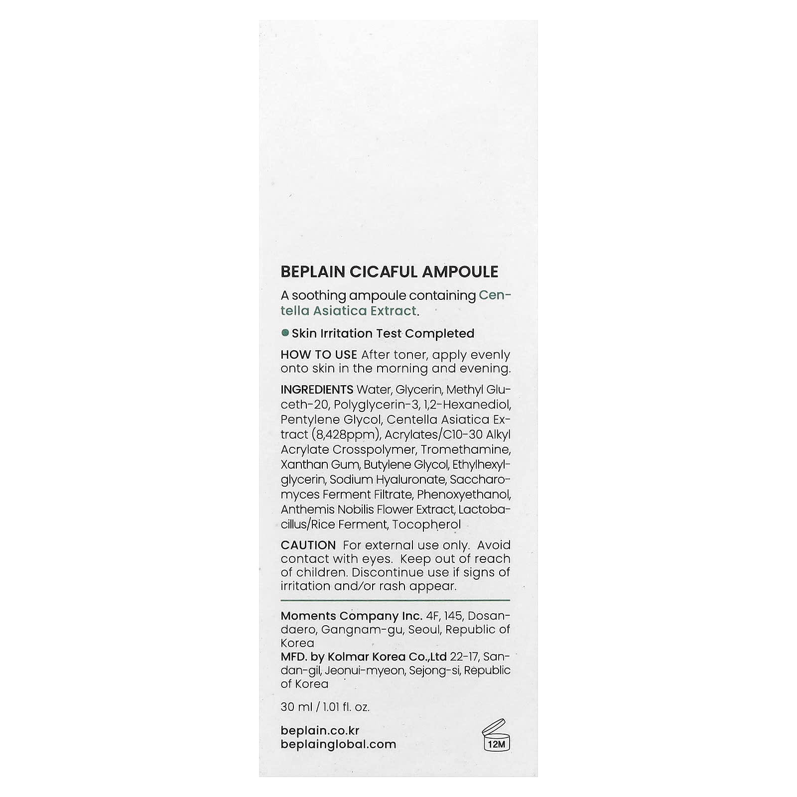Вода, глицерин, метилглюсет-20, полиглицерин-3, 1,2-гександиол, пентиленгликоль, экстракт готу колы (Centella asiatica) (8428 част./млн), Акрилат/C10-30 Алкилакрилатный кроссполимер, трометамин, Ксантановая камедь, бутиленгликоль, этилгексилглицерин, гиалуронат натрия, продукт ферментации дрожжевых грибков-сахаромицетов, феноксиэтанол, экстракт цветков ромашки английской (Anthemis nobilis), продукт ферментации бактерий Lactobacillus в присутствии риса, токоферол.