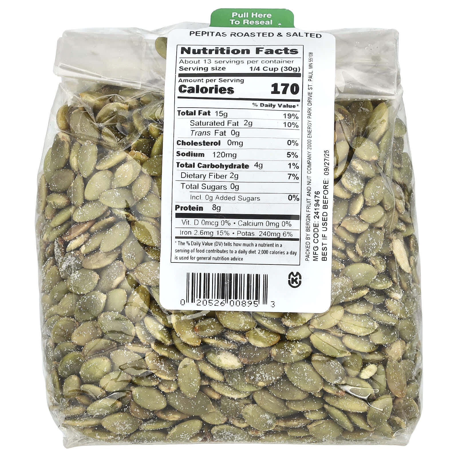 Ягоды тыквенных семечек (тыквенные семечки) (фарфор), высокоолеиновое подсолнечное масло и/или арахисовое масло, морская соль.