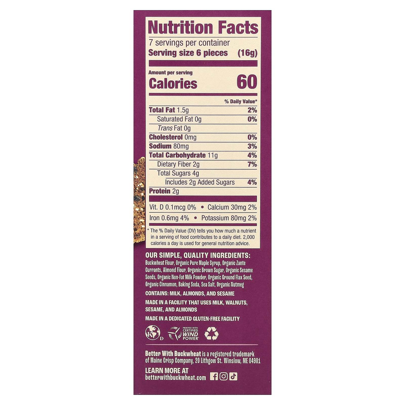 Better with Buckwheat, хрустящие снеки из штата Мэн, со вкусом кленового сиропа, корицы и смородины, 105 г (3,7 унции)