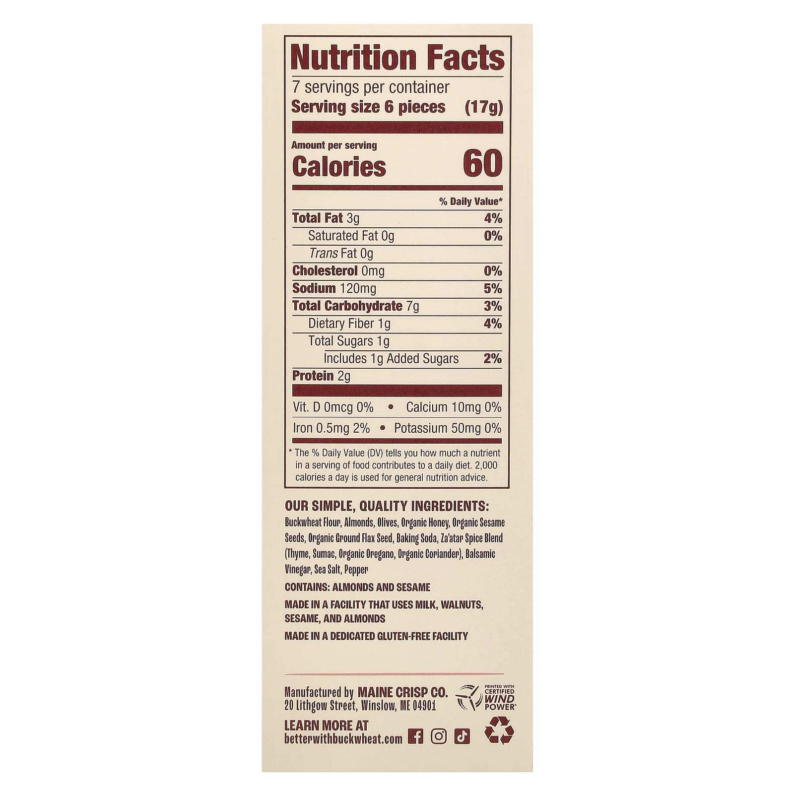 Гречишная мука, миндаль, оливки, органический мед, органические семена кунжута, органические молотые семена льна, пищевая сода, смесь специй за'атар (тимьян, сумах, органический орегано, органический кориандр), бальзамический уксус, морская соль, перец.