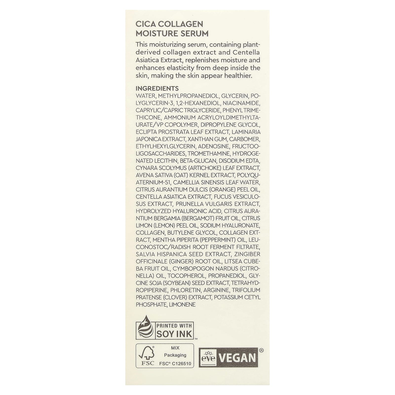 Эта увлажняющая сыворотка, содержащая экстракт растительного коллагена и экстракт центеллы азиатской, восстанавливает влагу и повышает эластичность кожи, делая ее более здоровой.