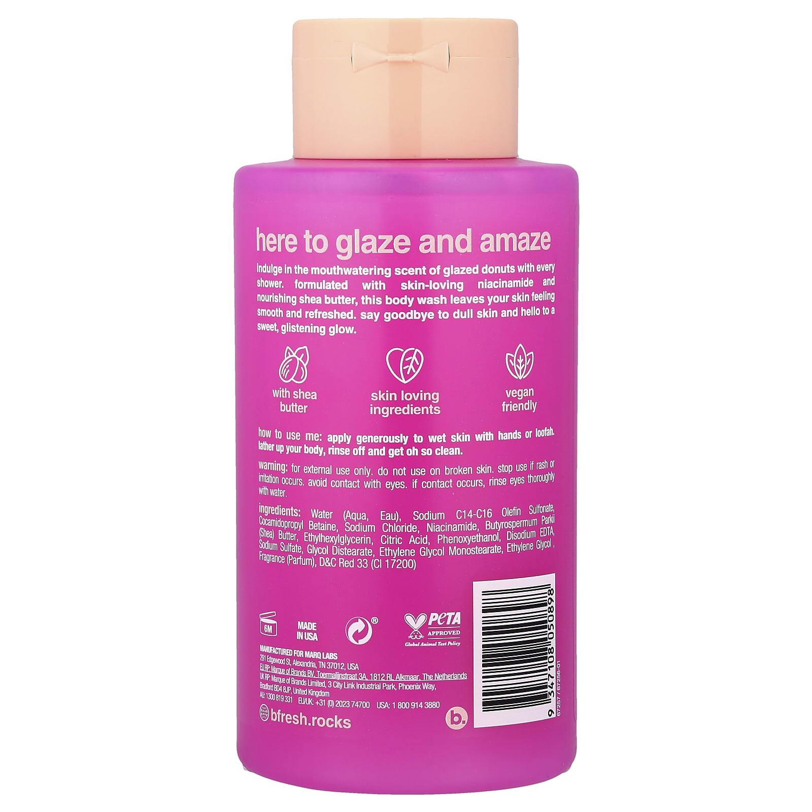 Наслаждайтесь аппетитным ароматом глазированных пончиков при каждом приеме душа. Этот гель для душа, созданный с благоприятным для кожи никотинамидом и питательным маслом ши, делает кожу гладкой и свежей. Забудьте о тусклой коже и познакомьтесь с сияющей кожей.