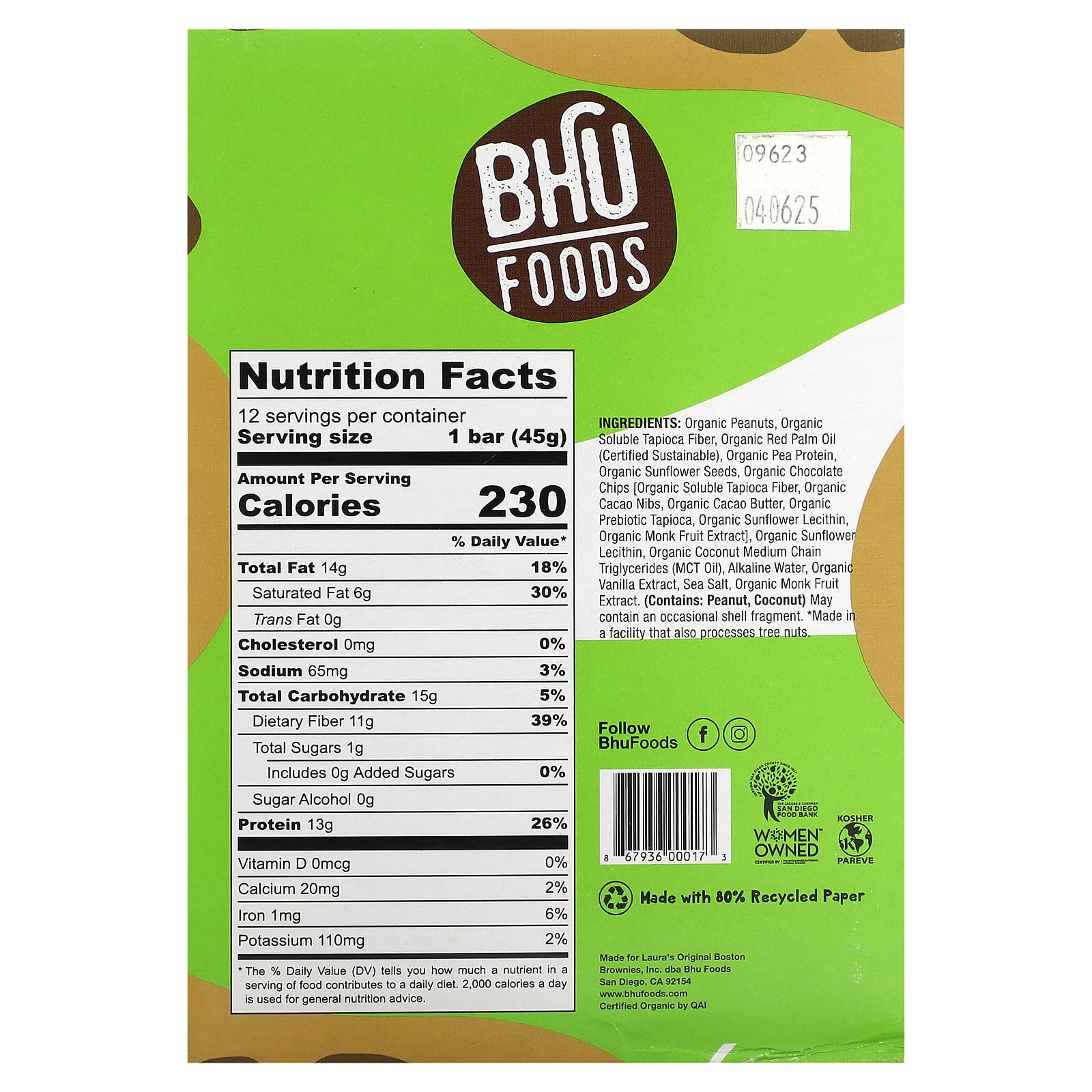 Органический арахис, органическая растворимая клетчатка тапиоки, органическое красное пальмовое масло (сертифицировано), органический гороховый протеин, органические семена подсолнечника, органическая шоколадная крошка [органическая растворимая тапиоковая клетчатка, органические ядра какао-бобов, органическое масло какао, органический пребиотик из тапиоки, органический подсолнечный лецитин, органический экстракт плодов архата], органический подсолнечный лецитин, органические среднецепочечные триглицериды из кокоса (масло mct), щелочная вода, органический экстракт ванили, морская соль, органический экстракт плодов монаха. (содержит: арахис, кокос)