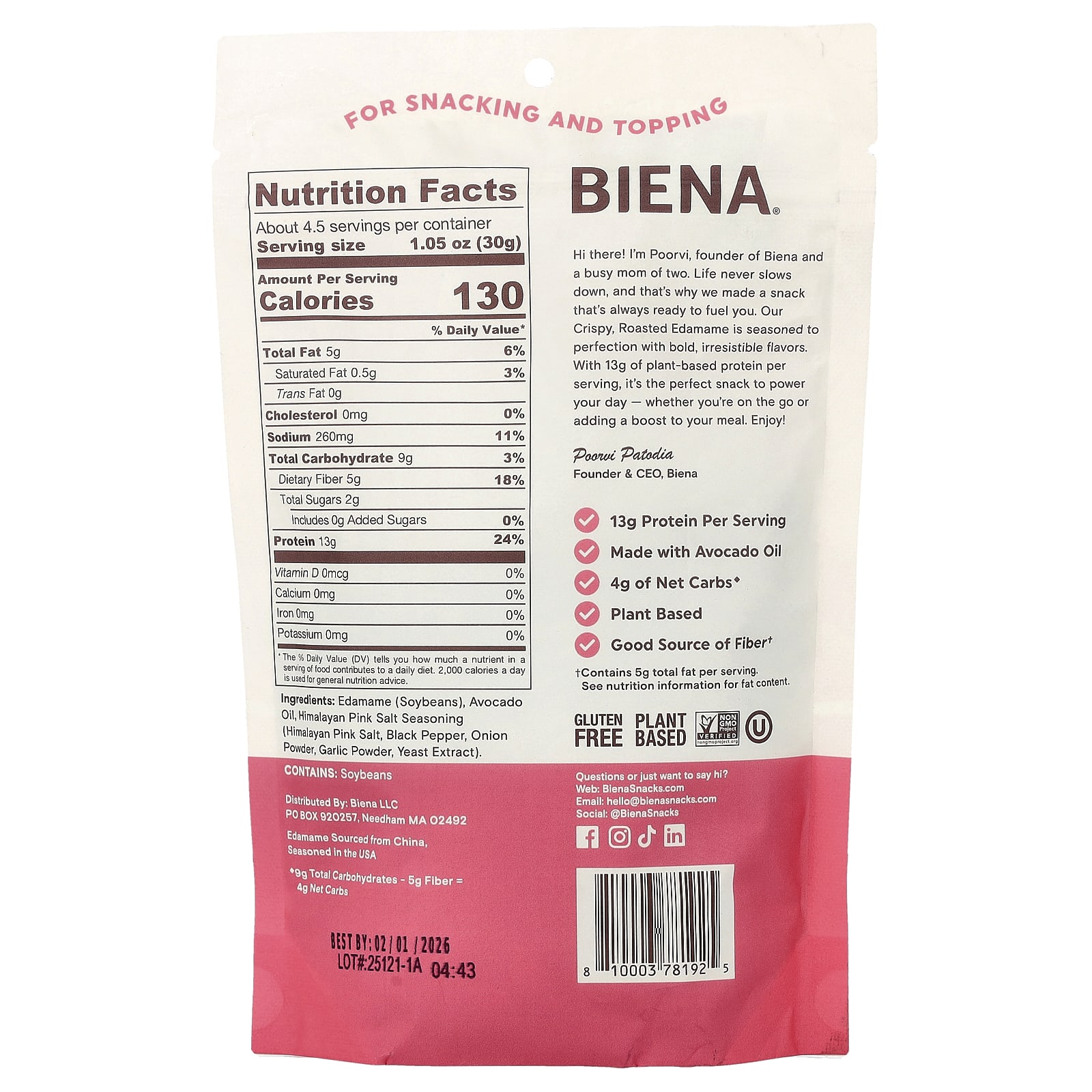Hi there! I'm Poorvi, founder of Biena and a busy mom of two. Life never slows down, and that's why we made a snack that's always ready to fuel you. Our Crispy, Roasted Edamame is seasoned to perfection with bold, irresistible flavors. With 12g of plant-based protein per serving, it's the perfect snack to power your day - whether you're on the go or adding a boost to your meal. Enjoy! -Poorvi Patodia, Founder & CEO, Biena
