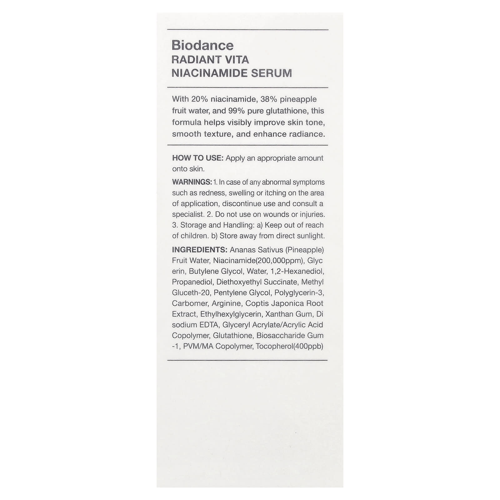 Соковая вода из ананаса (Ananas sativus), никотинамид (200 000 част./млн), глицерин, бутиленгликоль, вода, 1,2-гександиол, пропандиол, диэтоксиэтил сукцинат, метил глюцет-20, пентилен гликоль, полиглицерин-3, карбомер, аргинин, экстракт корня коптиса японского (Coptis japonica), этилгексилглицерин, ксантановая камедь, двунатриевая ЭДТК, сополимер глицерил акрилата/акриловой кислоты, глутатион, биосахаридная смола-1, ПВМ/МА сополимер, токоферол (400 част./млрд).