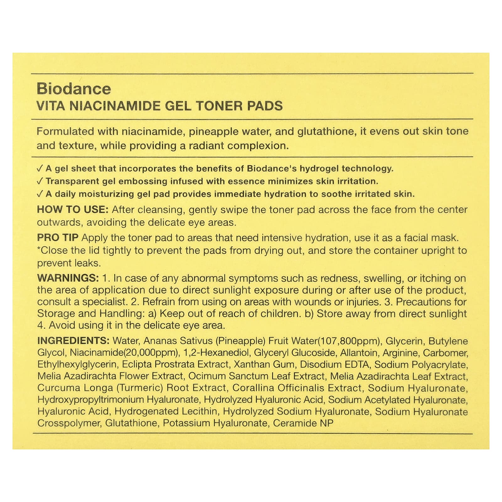 Вода, ананас (Ananas sativus) (107 800 част./млн), глицерин, бутиленгликоль, никотинамид (20 000 част./млн), 1,2-гександиол, глицерил глюкозид, аллантоин, аргинин, карбомер, этилгексилглицерин, экстракт эклипты простёртой (Eclipta prostrata), ксантановая камедь, двунатриевая ЭДТК, полиакрилат натрия, экстракт цветков дерева ним (Melia azadirachta), экстракт листьев туласи (Ocimum sanctum), экстракт листьев дерева ним (Melia azadirachta), экстракт корня куркумы (Curcuma longa), экстракт кораллины лекарственной (Corallina officinalis), гиалуронат натрия, гиалуронат гидроксипропилтримония, гидролизованная гиалуроновая кислота, ацетилированный гиалуронат натрия, гиалуроновая кислота, гидрогенизированный лецитин, гидролизованный гиалуронат натрия, кроссполимер гиалуроната натрия, глутатион, гиалуронат калия, керамид NP.