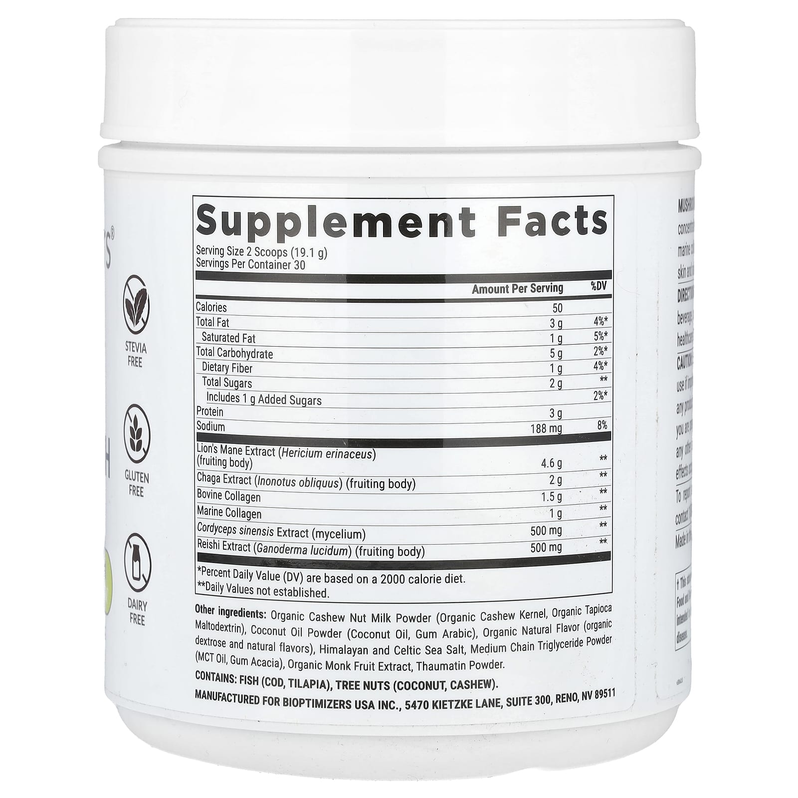 Сухое органическое молоко из орехов кешью (органические ядра кешью, органический тапиоковый мальтодекстрин), порошок из кокосового масла (кокосовое масло, гуммиарабик), органический натуральный ароматизатор (органическая декстроза и натуральные ароматизаторы), гималайская и кельтская морская соль, порошок среднецепочечных триглицеридов (масло, камедь акации), органический экстракт архата, тауматиновый порошок.