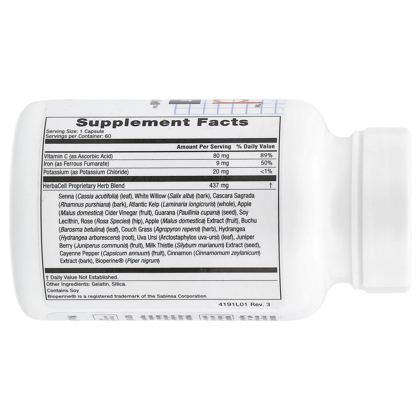 | Сенна (Cassia acutifolia) (лист), белая ива (Salix alba) (кора), каскара саграда (Rhamnus purshiana) (кора), атлантическая водоросль (Laminaria longicruris) (целая), яблочный (Malus domestica), сидровый уксус (плоды), Гуарана (Paullinia cupana) (семена), соевый лецитин, роза (разновидности розы) (бедро), экстракт яблока (Malus domestica) (плоды), бучу (Barosma betulina) (листья), трава кушетки (Agropyron repens) (трава), Гортензия (Hydrangea arborescens) (корень), толокнянка обыкновенная (Arctostaphylos uva-ursi) (листья), ягоды можжевельника (Juniperus communis) (плоды), экстракт расторопши пятнистой (Silybum marianum) (семена), кайенский перец (Capsicum annuum) (плоды ), Экстракт корицы (Cinnamomum zeylanicum) (кора), Bioperine® (Piper nigrum) | ||