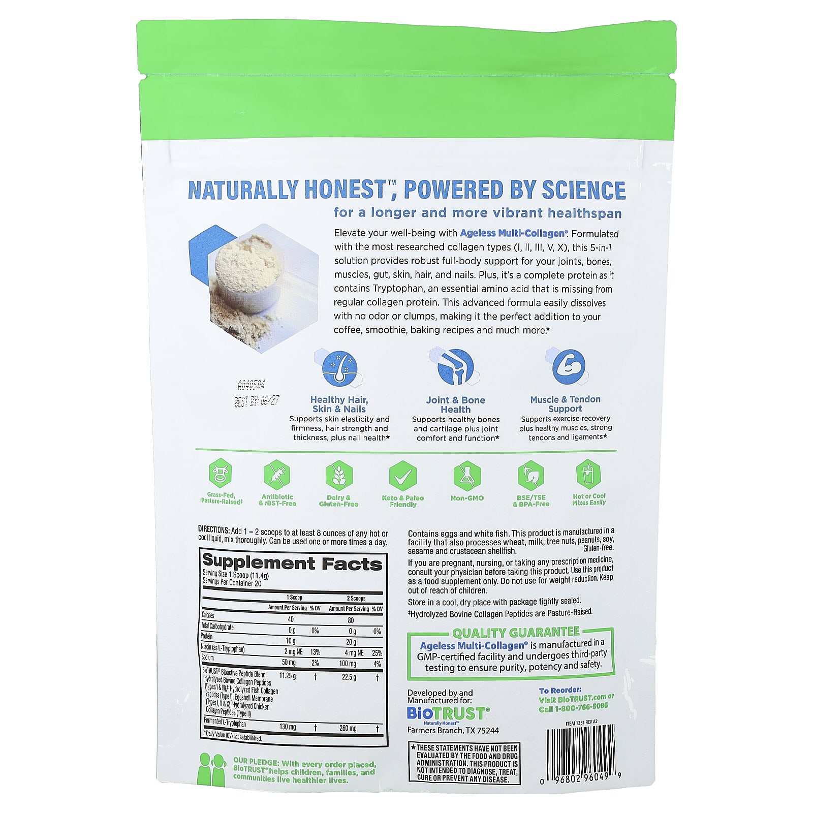 Гарантия качества. Multi-Collagen® Ageless производится на предприятии, имеющем регистрацию GMP, и проходит независимое тестирование для обеспечения чистоты, эффективности и безопасности.