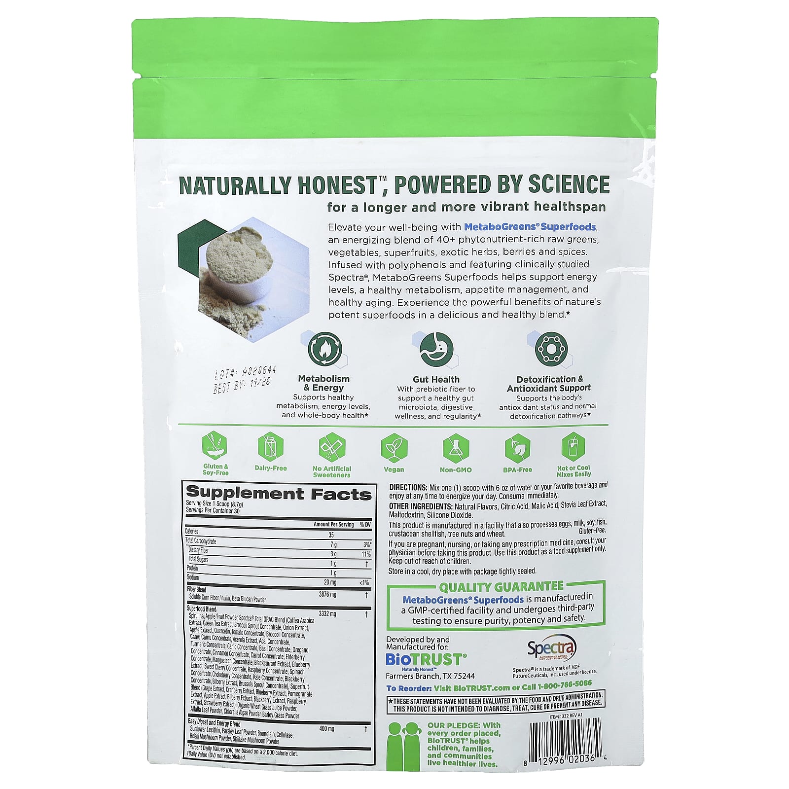 Улучшите самочувствие с помощью MetaboGreens® Superfoods, бодрящей смеси из более чем 40 необработанных зелени, овощей, суперфруктов, экзотических трав, ягод и специй. Суперфуды MetaboGreens с полифенолами и клинически изученным спектром Spectra® помогают поддерживать уровень энергии, здоровый обмен веществ, контроль аппетита и здоровое старение. Ощутите эффективные преимущества натуральных суперфудов в вкусной и полезной смеси.