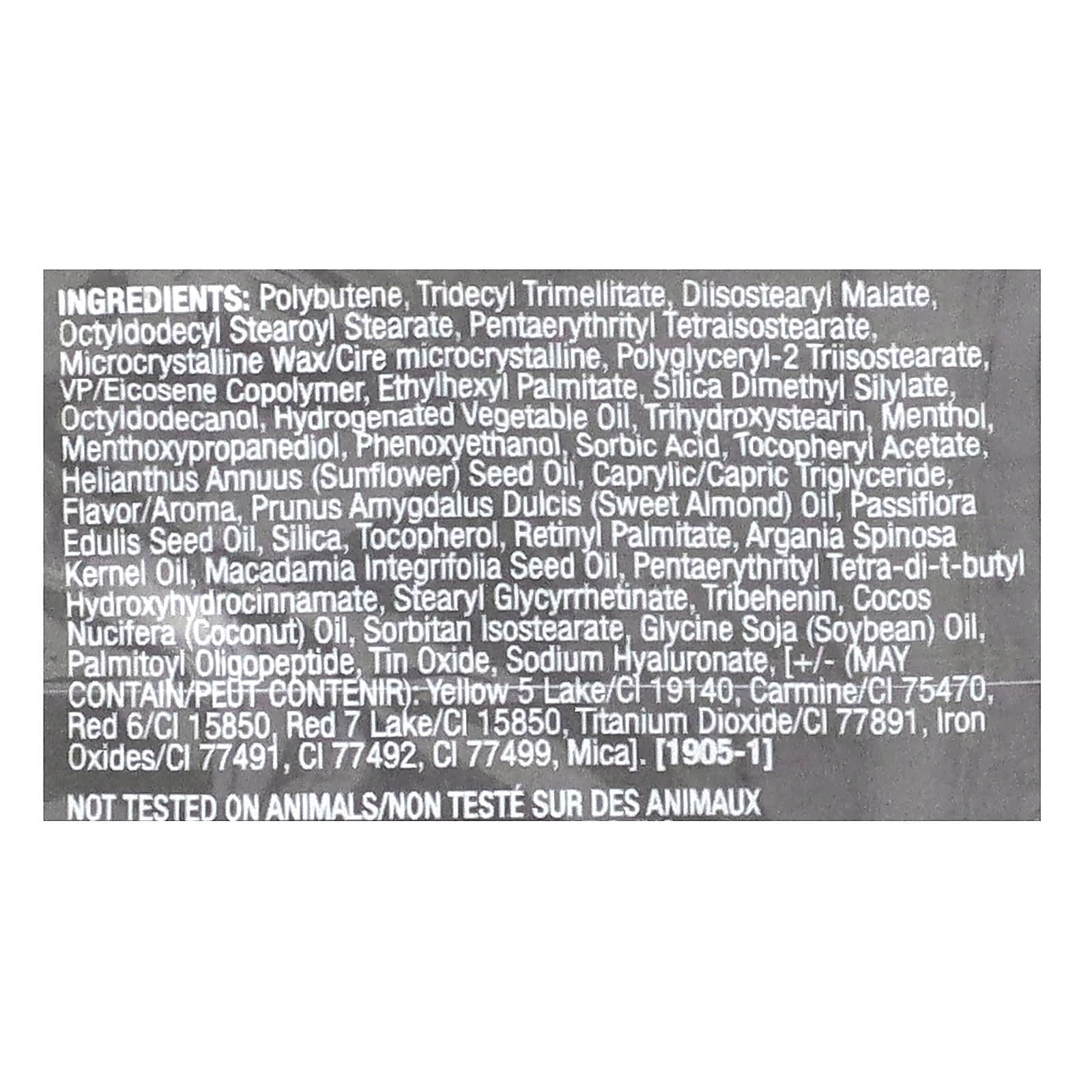 Полибутен, тридецил тримеллитат, диизостеарил малат октилдодецил стеароил стеарат, микрокристаллический воск пентаэритритил тетраизостеарат, полиглицерил-2 триизостеарат, ВП/эйкозен сополимер, этилгексил пальмитат, диметил силилат диоксида кремния октилдодеканол, гидрогенизированное растительное масло, тригидроксистеарин, ментол, ментоксипропандиол, феноксиэтанол, сорбиновая кислота, токоферилацетат, масло семян подсолнечника (Helianthus annuus), каприловый/каприновый триглицерид, ароматизатор, масло сладкого миндаля (Prunus amygdalus dulcis), масло из семян маракуйи (Passiflora edulis), диоксид кремния, токоферол, ретинилпальмитат, аргановое масло (Argania spinosa), масло макадамии (Macadamia integrifolia), пентаэритритил тетра-ди-трет-бутил гидроксигидроциннамат, стеарил глицирретинат, трибехенин, кокосовое масло (Cocos nucifera), сорбитан изостеарат, соевое масло (Glycine soja), пальмитоил олигопептид, оксид олова, гиалуронат натрия,