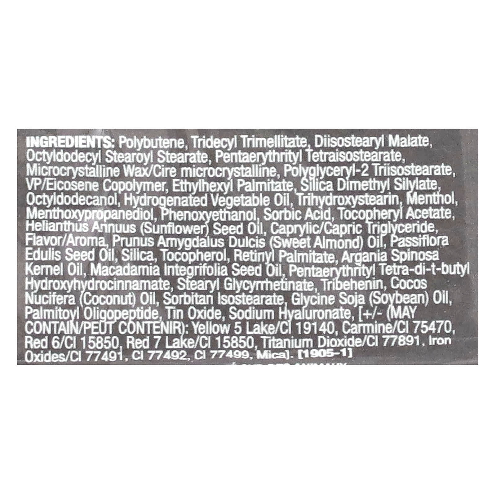 Полибутен, тридецил тримеллитат, диизостеарил малат, октилдодецил стеароил стеарат, микрокристаллический воск пентаэритритил тетраизостеарат, полиглицерил-2 триизостеарат, ВП/эйкозен сополимер, этилгексил пальмитат, диметил силилат диоксида кремния, октилдодеканол, гидрогенизированное растительное масло, тригидроксистеарин, ментол, ментоксипропандиол, феноксиэтанол, сорбиновая кислота, токоферилацетат, подсолнечное масло (Helianthus annuus), каприловый/каприновый триглицерид, ароматизатор, масло сладкого миндаля (Prunus amygdalus dulcis), масло из семян маракуйи (Passiflora edulis), диоксид кремния, токоферол, ретинилпальмитат, аргановое масло (Argania spinosa), масло макадамии (Macadamia integrifolia), пентаэритритил тетра-ди-трет-бутил гидроксигидроциннамат, стеарил глицирретинат, трибехенин, кокосовое масло (Cocos nucifera), сорбитан изостеарат, соевое масло (Glycine soja), пальмитоил олигопептид, оксид олова, гиалуронат натрия, [может содержать краситель желтый 5 лак (CI 19140), кармин (CI 75470), краситель красный 6 (CI 15850), краситель красный 7 лак (CI 15850), диоксид титана (CI 77891), оксиды железа (CI 77491), CI 77492, CI 77499, слюду].