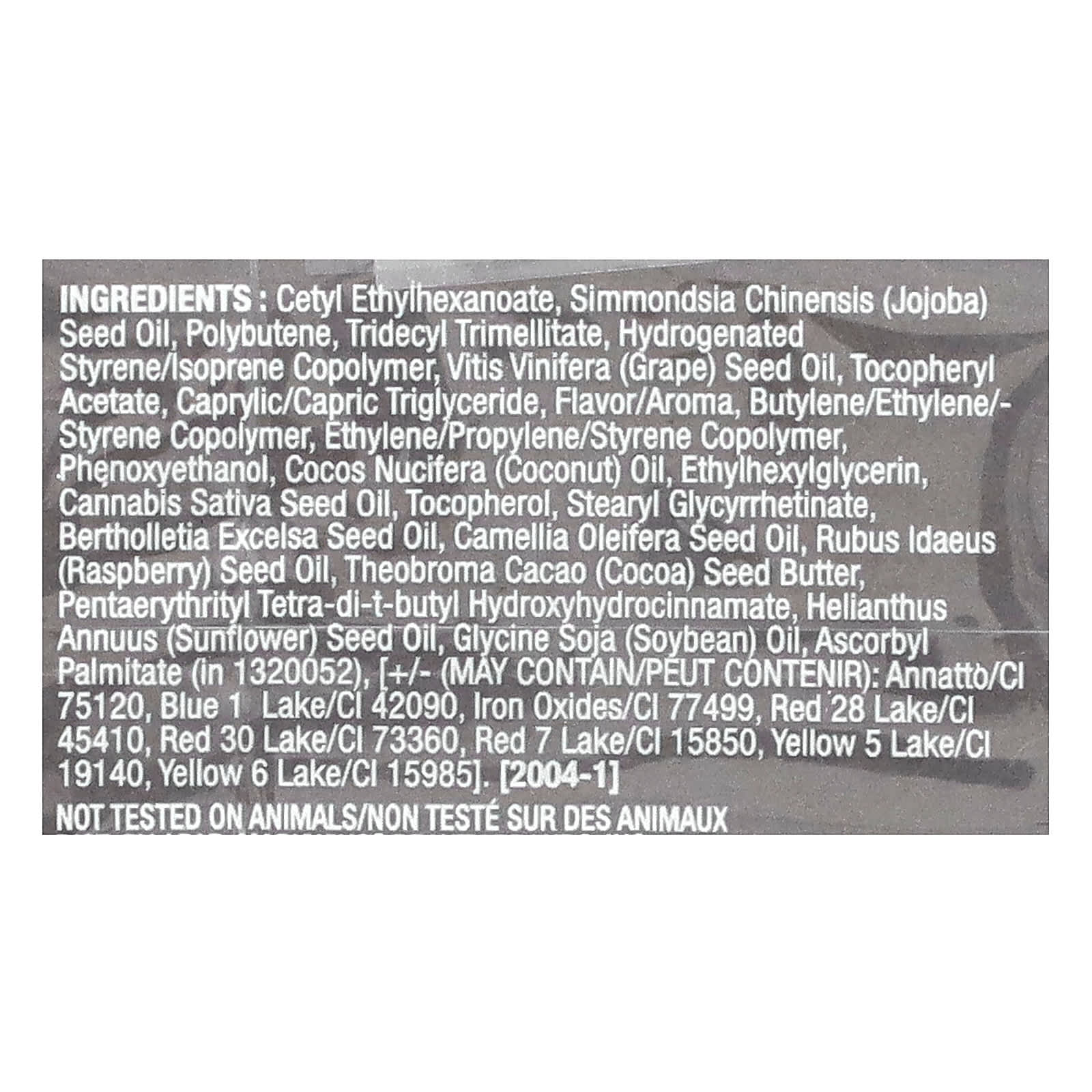 Цетил этилгексаноат, масло из семян жожоба (Simmondsia chinensis), полибутен, тридецил тримеллитат, гидрогенизированный изопренстирольный сополимер, масло из виноградных косточек (Vitis vinifera), токоферилацетат, каприловый/каприновый триглицерид, ароматизатор, сополимер бутилена/этилена/стирола, сополимер этилена/пропилена/стирола, феноксиэтанол, кокосовое масло (Cocos nucifera), этилгексилглицерин, конопляное масло (Cannabis sativa), токоферол, стеарил глицирретинат, масло из семян березы (Bertholletia Excelsa), масло из семян камелии масличной (Camellia oleifera), масло семян малины (Rubus idaeus), масло из зерен какао (Theobroma cacao), пентаэритритил тетра-ди-трет-бутил гидроксигидроциннамат, подсолнечное масло (Helianthus annuus), соевое масло (Glycine soja), аскорбил пальмитат (в № 1320052), [может содержать аннато (CI 75120), краситель синий 1 лак (CI 42090), оксиды железа/CI 77499, краситель красный 28 лак (CI 45410), краситель красный 30 лак/CI 73360, краситель красный 7 лак (CI 15850), краситель желтый 5 лак (CI 19140). краситель желтый 6 лак (CI 15985).
