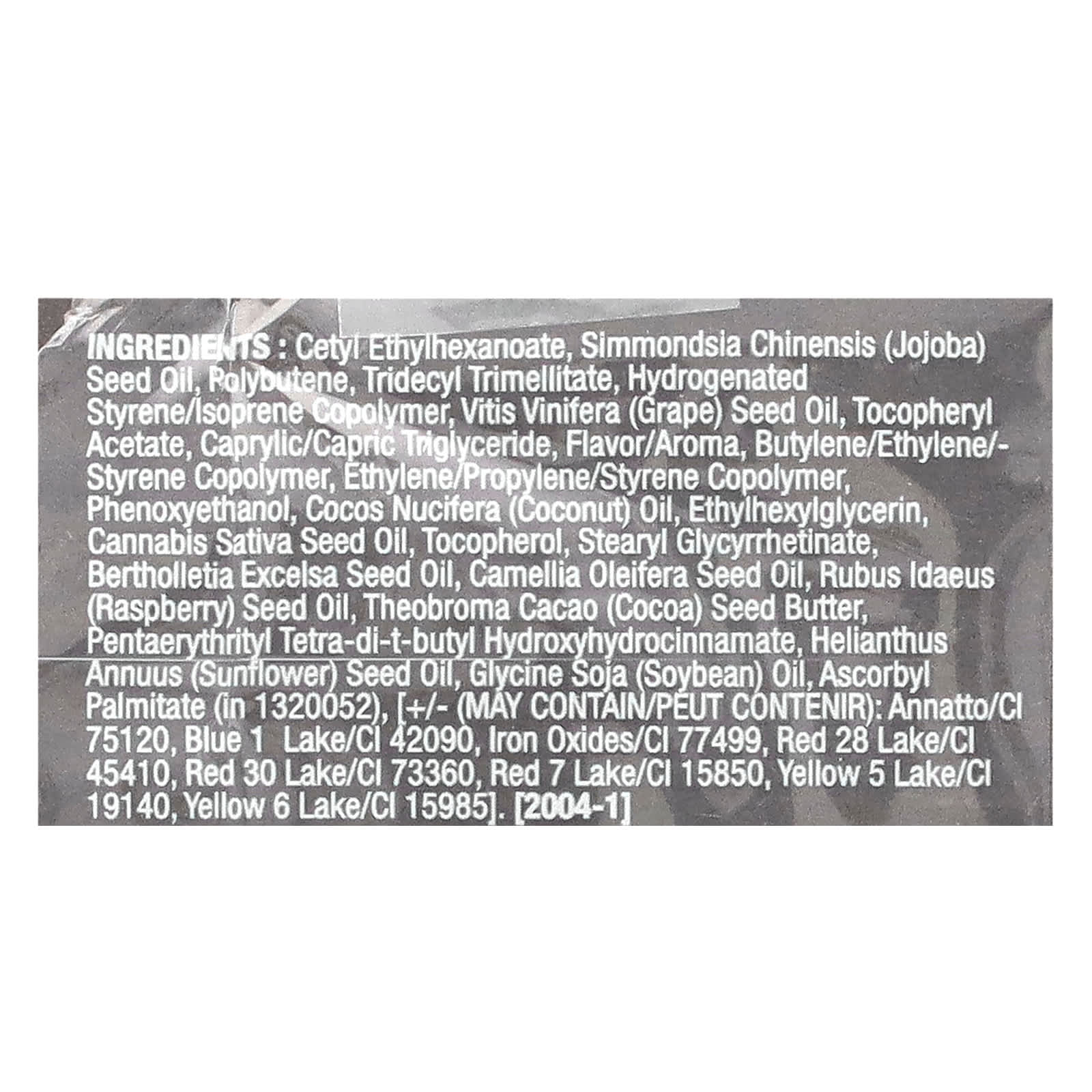 Цетил этилгексаноат, масло из семян жожоба (Simmondsia chinensis), полибутен, тридецил тримеллитат, гидрогенизированный изопренстирольный сополимер, масло из виноградных косточек (Vitis vinifera), токоферилацетат, каприловый/каприновый триглицерид, ароматизатор, сополимер бутилена/этилена/стирола, сополимер этилена/пропилена/стирола, феноксиэтанол, кокосовое масло (Cocos nucifera), этилгексилглицерин, масло семян конопли (Cannabis sativa), токоферол, стеарил глицирретинат, масло из семян березы (Bertholletia Excelsa), масло из семян камелии масличной (Camellia oleifera), масло семян малины (Rubus idaeus), масло зерен какао (Theobroma cacao), пентаэритритил тетра-ди-трет-бутил гидроксигидроциннамат, подсолнечное масло (Helianthus annuus), соевое масло (Glycine soja), аскорбил пальмитат (в № 1320052)