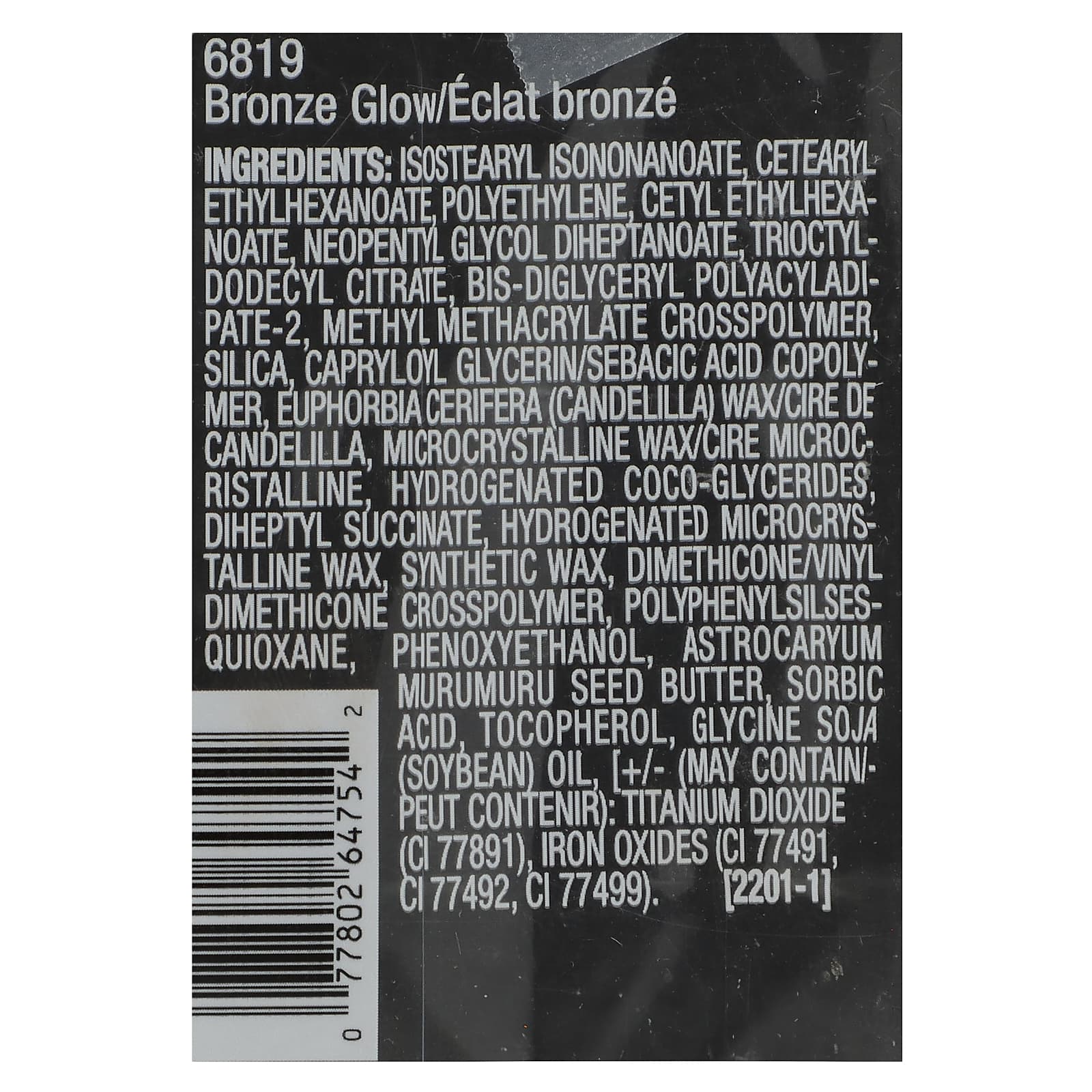 изостеарил изононаноат, цетеариловый этилгексаноат, полиэтилен, цетилэтилгексаноат, неопентилгликоль дигептаноат, триоктилдодецилцитрат, бис-диглицерил полиациладипат-2, метил метакрилат кроссполимер, диоксид кремния, каприлоил глицерин/сополимер себациновой кислоты, канделильский воск (Euphorbia cerifera), микрокристаллический, гидрогенизированные кокоглицериды, дигептил сукцинат, гидрогенизированный микрокристаллический воск, синтетический воск, диметикон/винил диметикон кроссполимер, полифенилсилсесквиоксан, феноксиэтанол, масло семян мурумуру (Astrocaryum murumuru), сорбиновая кислота, токоферол, соевое масло (Glycine soja), [может содержать диоксид титана (CI 77891), оксиды железа (CI 77491, CI 77492, CI 77499).