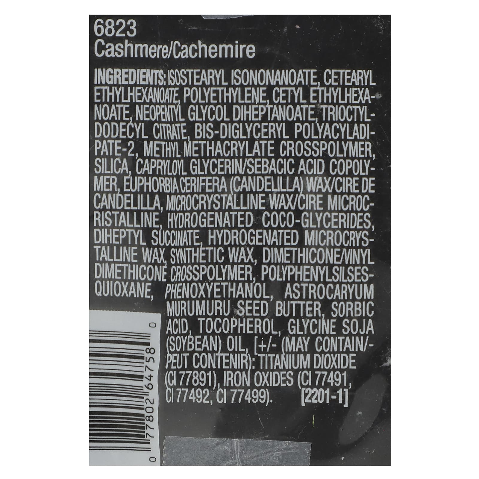 изостеарил изононаноат, цетеариловый этилгексаноат, полиэтилен, цетилэтилгексаноат, неопентилгликоль дигептаноат, триоктилдодецилцитрат, бис-диглицерил полиациладипат-2, метил метакрилат кроссполимер, диоксид кремния, каприлоил глицерин/сополимер себациновой кислоты, канделильский воск (Euphorbia cerifera), микрокристаллический воск, гидрогенизированные кокоглицериды, дигептил сукцинат, гидрогенизированный микрокристаллический воск, синтетический воск, диметикон/винил диметикон кроссполимер, полифенилсилсесквиоксан, феноксиэтанол, масло семян мурумуру (Astrocaryum murumuru), сорбиновая кислота, токоферол, соевое масло (Glycine soja), [может содержать диоксид титана (CI 77891), оксиды железа (CI 77491, CI 77492, CI 77499).