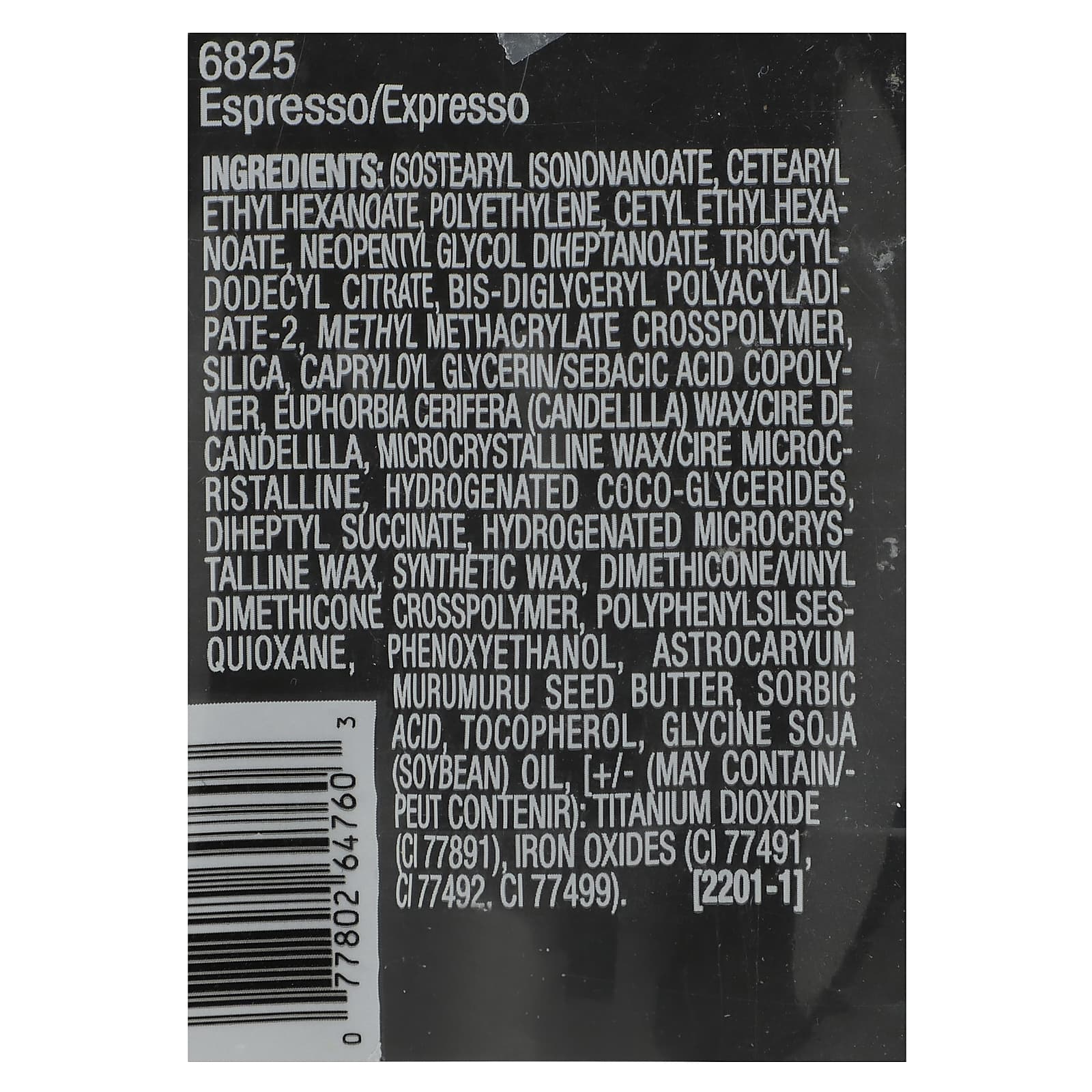 изостеарил изононаноат, цетеариловый этилгексаноат, полиэтилен, цетилэтилгексаноат, неопентилгликоль дигептаноат, триоктилдодецилцитрат, бис-диглицерил полиациладипат-2, метил метакрилат кроссполимер, диоксид кремния, каприлоил глицерин/сополимер себациновой кислоты, канделильский воск (Euphorbia cerifera), микрокристаллический воск, гидрогенизированные кокоглицериды, дигептил сукцинат, гидрогенизированный микрокристаллический воск, синтетический воск, диметикон/винил диметикон кроссполимер, полифенилсилсесквиоксан, феноксиэтанол, масло семян мурумуру (Astrocaryum murumuru), сорбиновая кислота, токоферол, соевое масло (Glycine soja) , [может содержать диоксид титана (CI 77891), оксиды железа (CI 77491, CI77492, CI 77499).