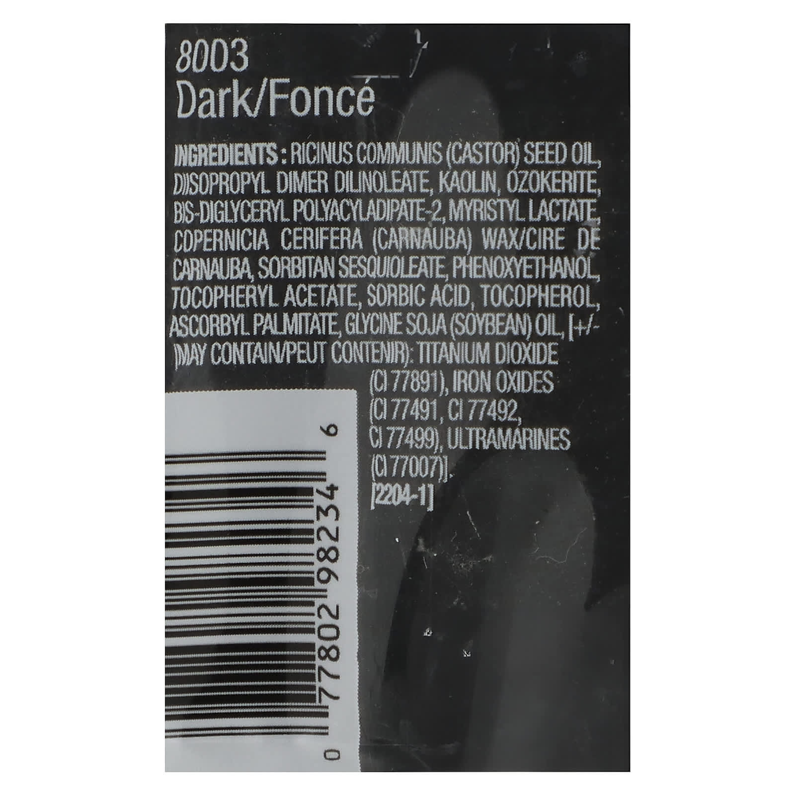 Касторовое масло (Ricinus communis), диизопропил димер дилинолеат, каолин, озокерит, бис-диглицерил полиациладипат-2, миристил лактат, карнаубский воск (Copernicia cerifera), сорбитана сесквиолеат, феноксиэтанол, токоферилацетат, сорбиновая кислота, токоферол, аскорбил пальмитат, соевое масло (Glycine soja), [Может содержать: диоксид титана (CI 77891), оксиды железа (CI 77491, CI 77492, CI 77499), ультрамарины (CI 77007)]. [2204-1]