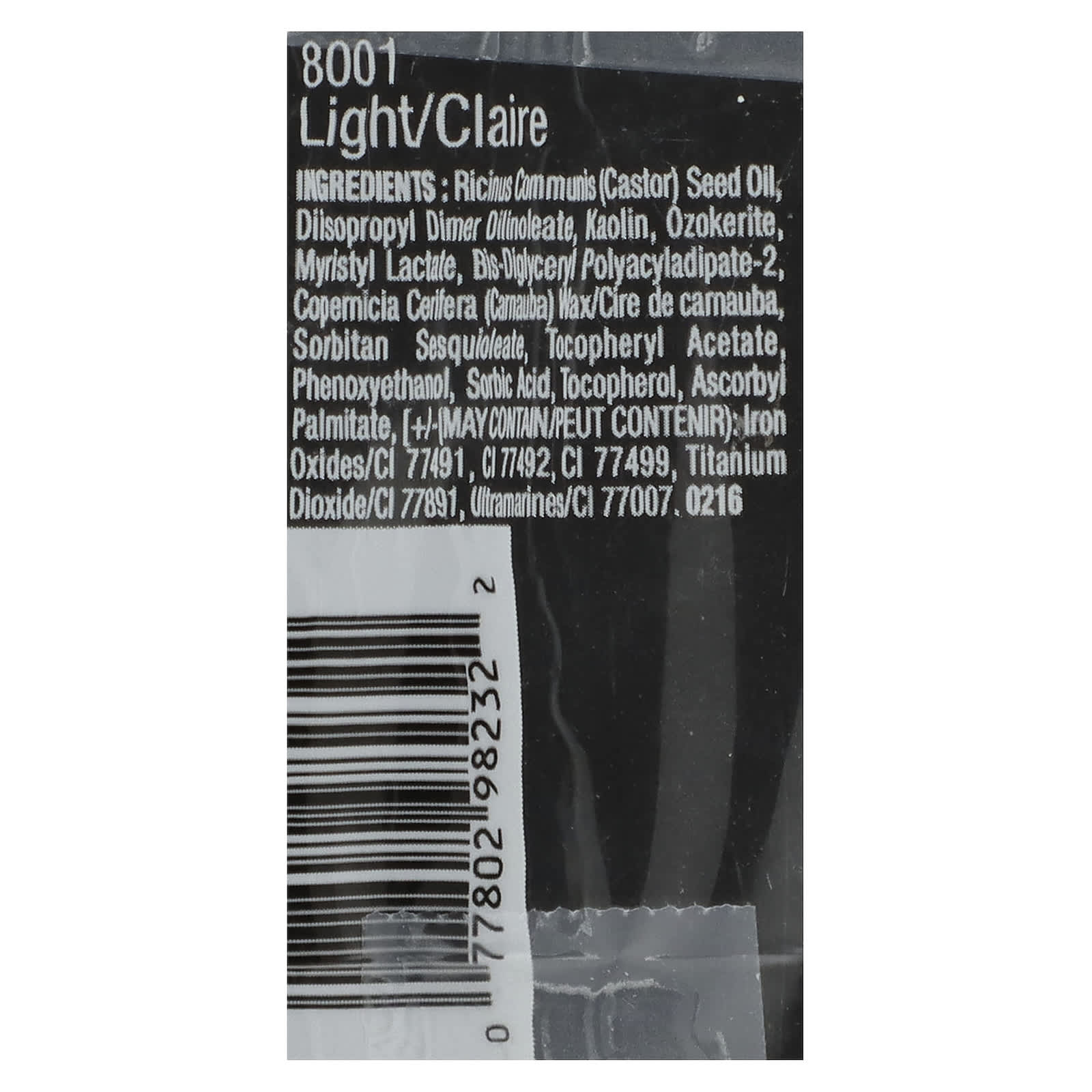 Касторовое масло (Ricinus communis), диизопропил димер дилинолеат, каолин, озокерит, миристил лактат, бис-диглицерил полиациладипат-2, карнаубский воск (Copernicia cerifera), сорбитана сесквиолеат, токоферилацетат, феноксиэтанол, сорбиновая кислота, токоферол, аскорбил пальмитат., [может содержать: оксиды железа (CI 77491), CI 77492, CI 77499), диоксид титана (CI 77891), ультрамарины (CI 77007).