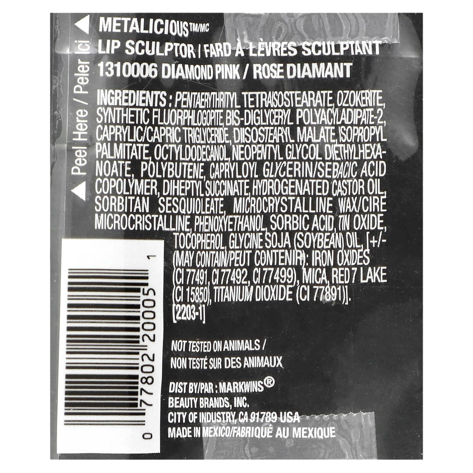 Пентаэритритил тетраизостеарат, озокерит, синтетический фторфлогопит, бис-диглицерил полиациладипат-2, каприловый/каприновый триглицерид, диизостеарил малат, изопропилпальмитат, октилдодеканол, неопентилгликоль диэтилгексаноат, полибутен, каприлоил глицерин/сополимер себациновой кислоты, дигептил сукцинат, гидрогенизированное касторовое масло, сорбитана сесквиолеат, микрокристаллический воск, феноксиэтанол, сорбиновая кислота, оксид олова, токоферол, соевое масло (Glycine soja) [может содержать: оксиды железа (CI 77491, CI 77492, CI 77499), слюда, краситель красный 7 лак (CI 15850)], диоксид титана (CI 77891)].