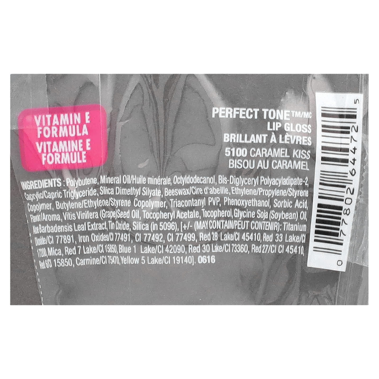 Полибутен, минеральное масло, октилдодеканол, бис-диглицерил полиациладипат-2, каприловый/каприновый триглицерид, диметил силилат диоксида кремния, пчелиный воск, сополимер этилена/пропилена/стирола, сополимер бутилена/этилена/стирола, триаконтанил ПВП, феноксиэтанол, сорбиновая кислота, ароматизатор, масло из виноградных косточек (Vitis vinifera), токоферилацетат, токоферол, соевое масло (Glycine soja), экстракт листьев алоэ вера (Aloe barbadensis), оксид олова, диоксид кремния (в 5096), [может содержать: диоксид титана (CI 77891), оксиды железа (CI 77491, CI 77492, CI 77499), краситель красный 28 лак (CI 45410), краситель красный 33 лак (CI 17200), слюда, краситель красный 7 лак/CI(15850, краситель синий 1 лак (CI 42090), краситель красный 30 лак/CI 73360, краситель красный 27 (CI 45410), красный 6CI 15850, кармин (CI 75470), краситель желтый 5 лак (CI 19140)].