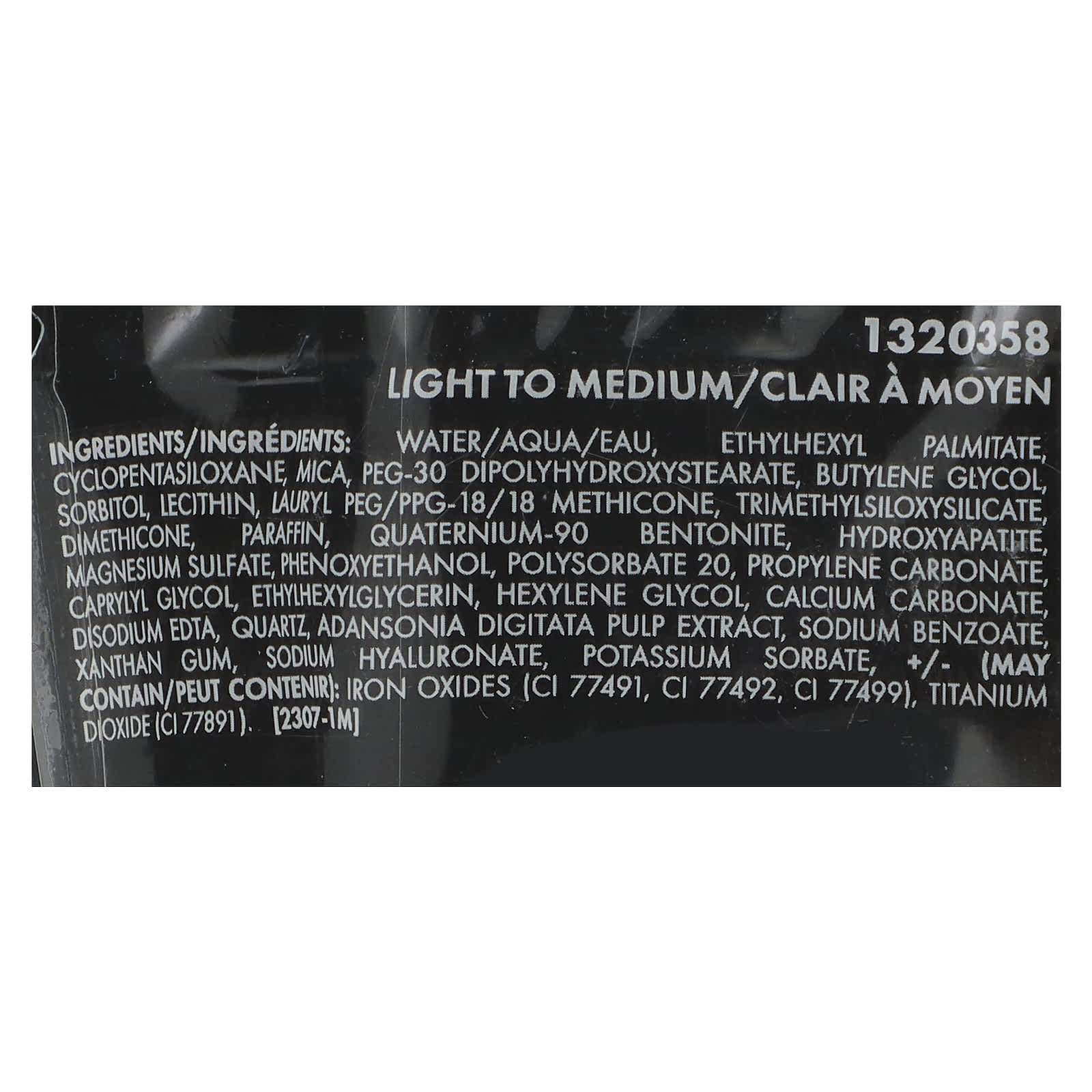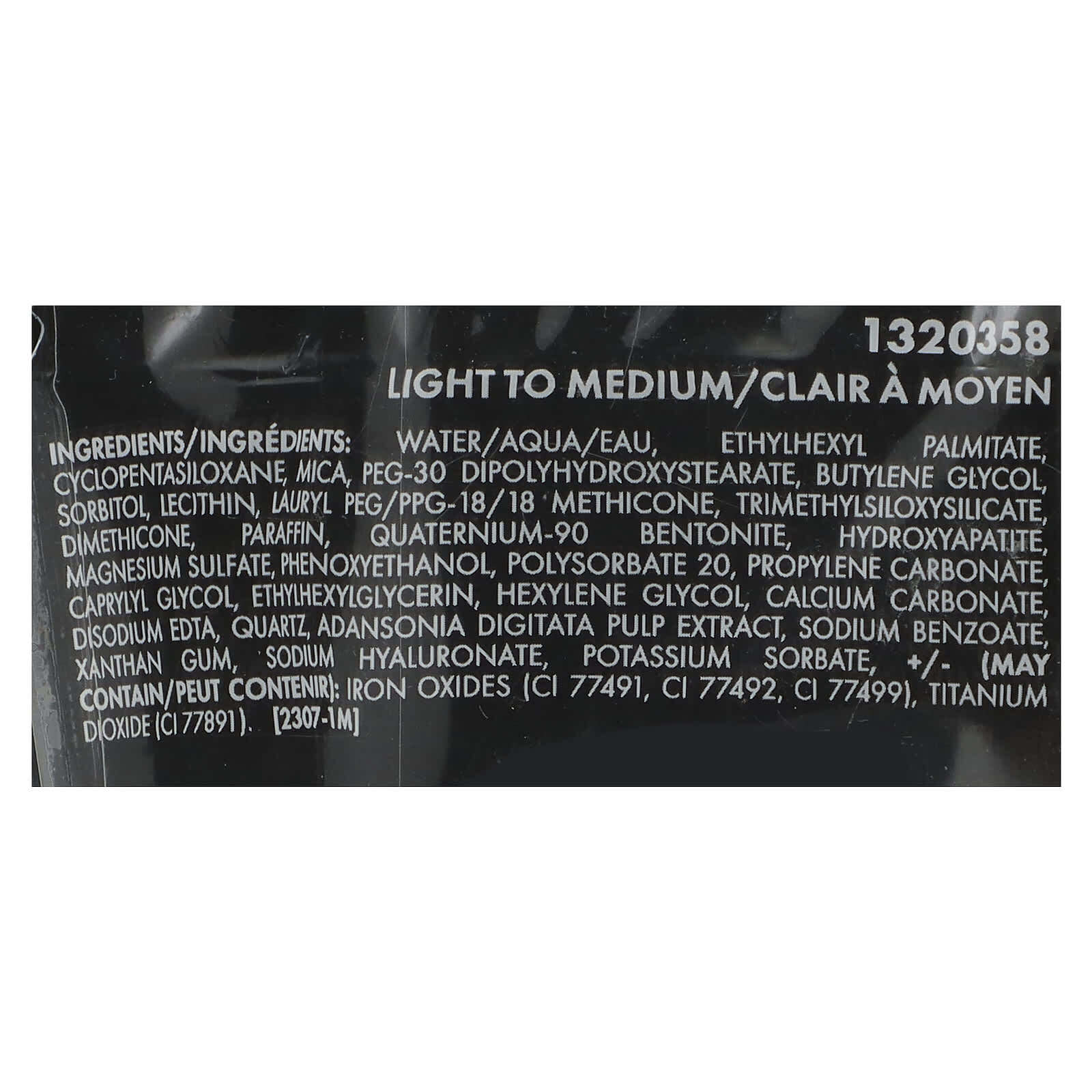 Вода, этилгексил циклопентасилоксан, слюда, ПЭГ-30 диполигидроксистеарат, бутиленгликоль, пальмитат, сорбитол, лецитин, лаурил ПЭГ/ППГ-18/18 метикон, триметилсилоксисиликат, диметикон, парафина, кватерниум-90 бентонит, гидроксиапатит, сульфат магния, феноксиэтанол, полисорбат 20, пропиленкарбонат, каприлилгликоль, этилгексилглицерин, гексиленгликоль, карбонат кальция, двунатриевая ЭДТК, кварц, экстракт мякоти баобаба (Adansonia digitata), бензоат натрия, ксантановая камедь, гиалуронат натрия, сорбат калия, (может содержать) оксиды железа (CI 77491, CI 77492, CI 77499), диоксид титана (CI 77891).