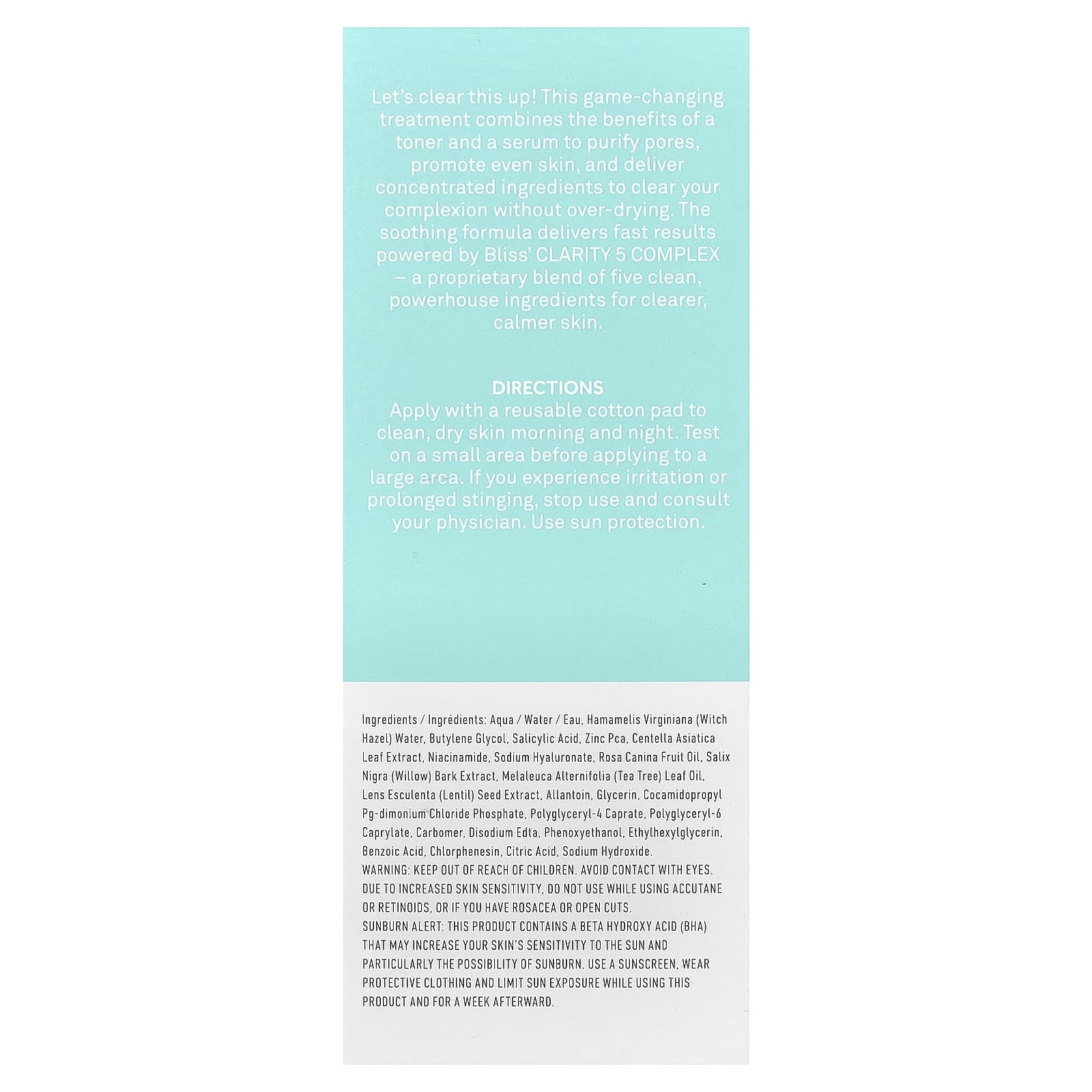 Давайте проясним это! Это меняющее правила средство, которое сочетает в себе преимущества тоника и сыворотки для очищения пор, выравнивания кожи и использования концентрированных ингредиентов для очищения кожи без пересушивания. Успокаивающая формула обеспечивает быстрые результаты благодаря комплексу Clarity 5 компании Bliss — запатентованной смеси из пяти чистых и эффективных ингредиентов, которые делают кожу более чистой и сияющей.
