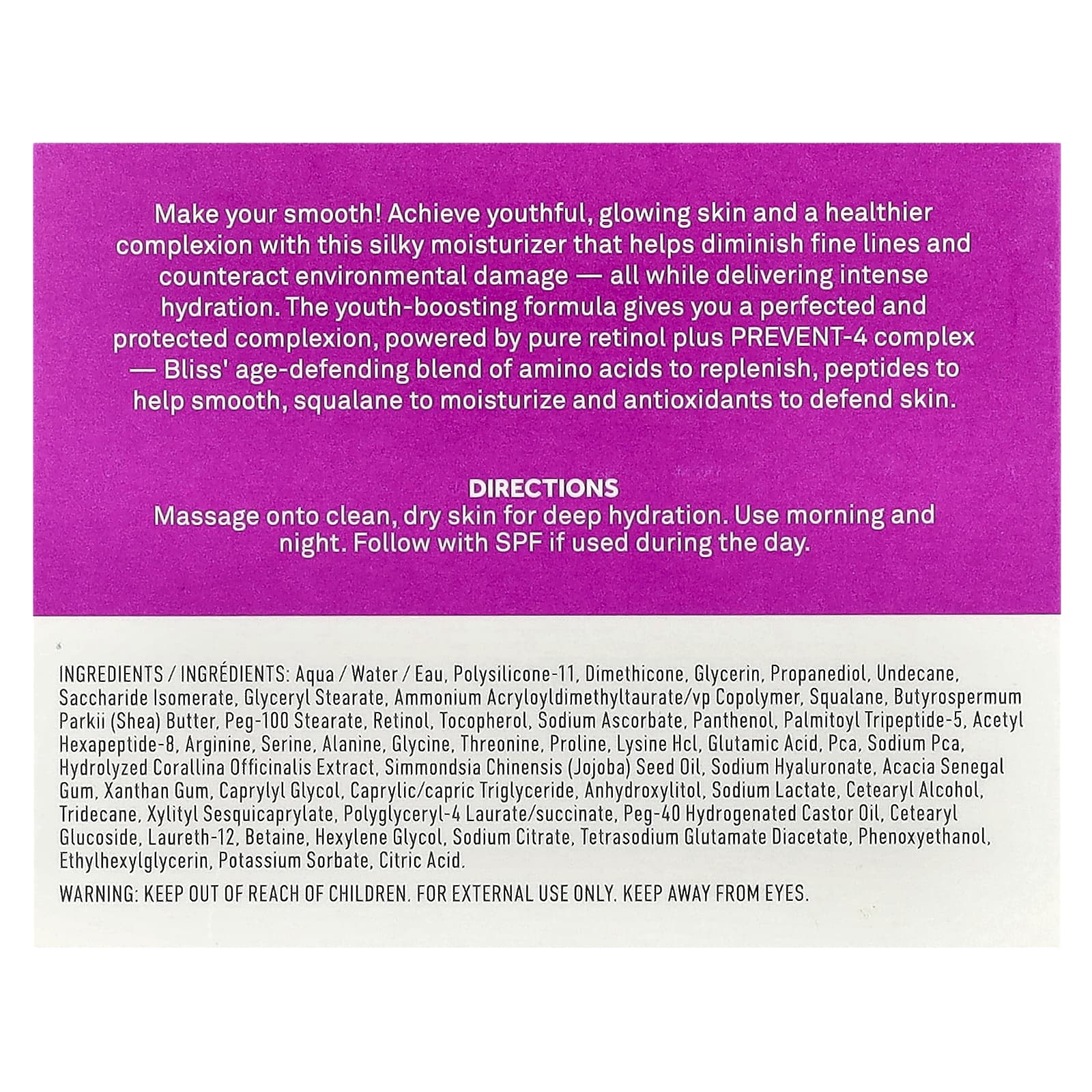 Сделайте свой гладкий! Этот шелковистый увлажняющий крем помогает уменьшить мелкие морщинки и нейтрализовать негативное воздействие окружающей среды, обеспечивая при этом интенсивное увлажнение. Формула, омолаживающая кожу, обеспечивает идеальный и защищенный цвет лица благодаря чистому ретинолу и комплексу Prevent-4 - омолаживающей смеси аминокислот Bliss для восстановления, пептидов для разглаживания, сквалану для увлажнения и антиоксидантам для защиты кожи.