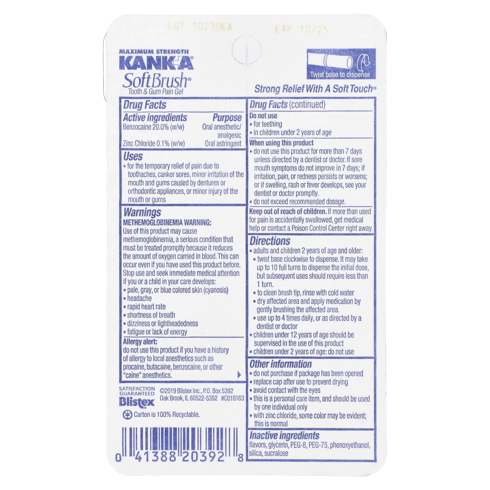 Kank-A® SoftBrush® - это первое средство от боли в полости рта, в котором лекарство доставляется в уникальном автономном дозаторе с кисточкой. Эта революционная конструкция позволяет с комфортом и точно наносить лекарства в наиболее труднодоступных местах, в том числе между зубами и вокруг брекетов.