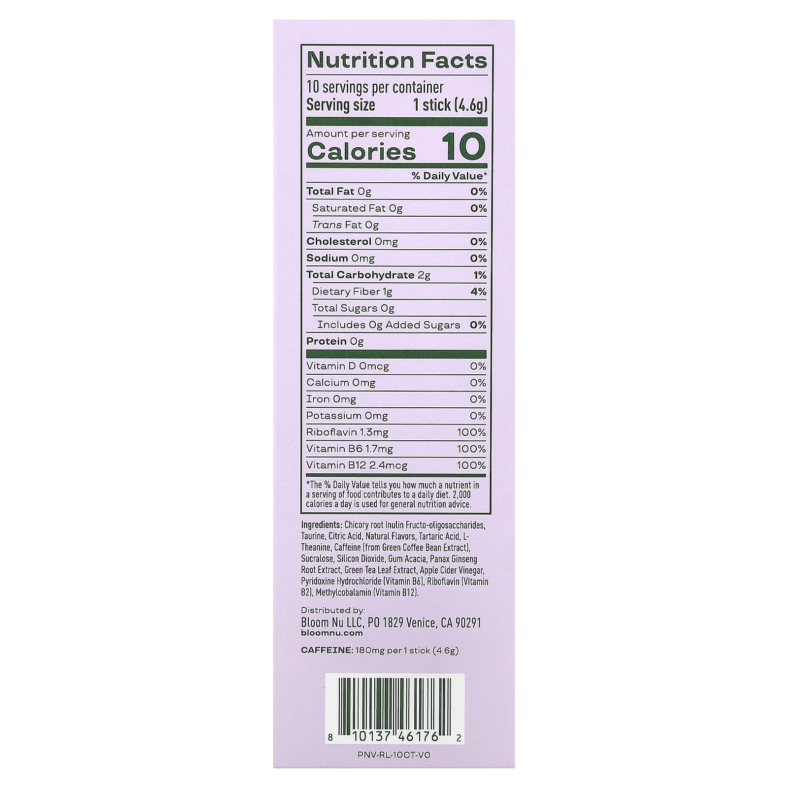 Фруктоолигосахариды инулина из корня цикория, таурин, лимонная кислота, натуральные ароматизаторы, винная кислота, L-теанин, кофеин (из экстракта зеленых кофейных зерен), сукралоза, диоксид кремния, аравийская камедь, экстракт корня женьшеня (Panax ginseng), экстракт листьев зелёного чая, яблочный уксус, пиридоксина гидрохлорид (витамин B6), рибофлавин (витамин B2), метилкобаламин (витамин B12).