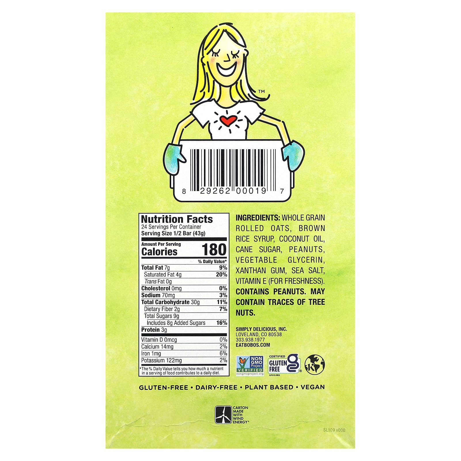 Цельнозерновой плющенный овес, сироп из бурого риса, кокосовое масло, тростниковый сахар, арахиса, растительный глицерин, ксантановая камедь, морская соль, витамин E (для сохранения свежести).