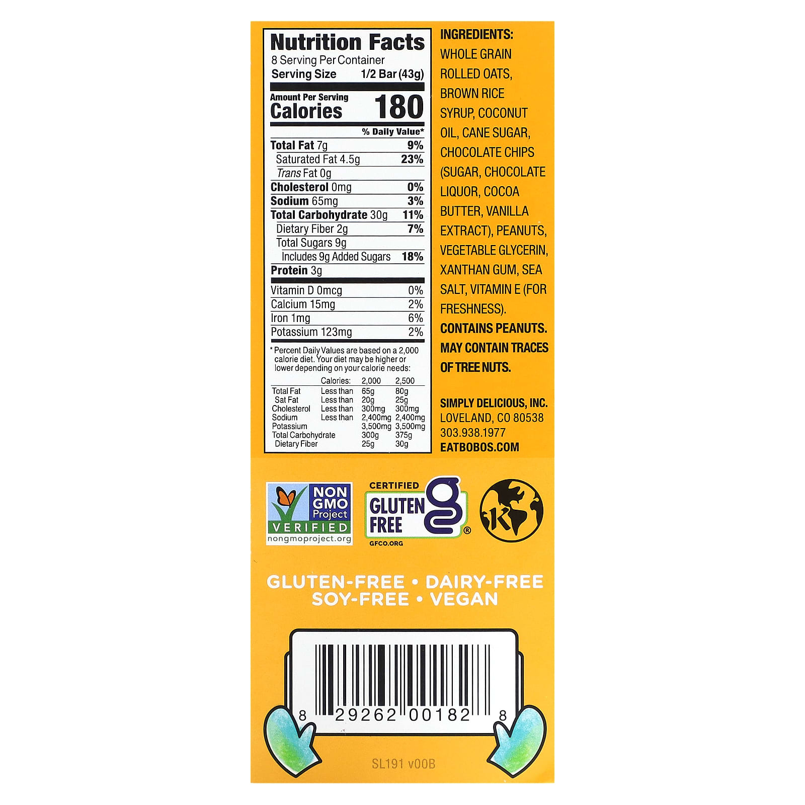 Цельнозерновой плющенный овес, сироп из бурого риса, кокосовое масло, тростниковый сахар, шоколадная крошка (сахар, тертое какао, какао-масло, ванильный экстракт), арахиса, растительный глицерин, ксантановая камедь, морская соль, витамин E (для сохранения свежести).