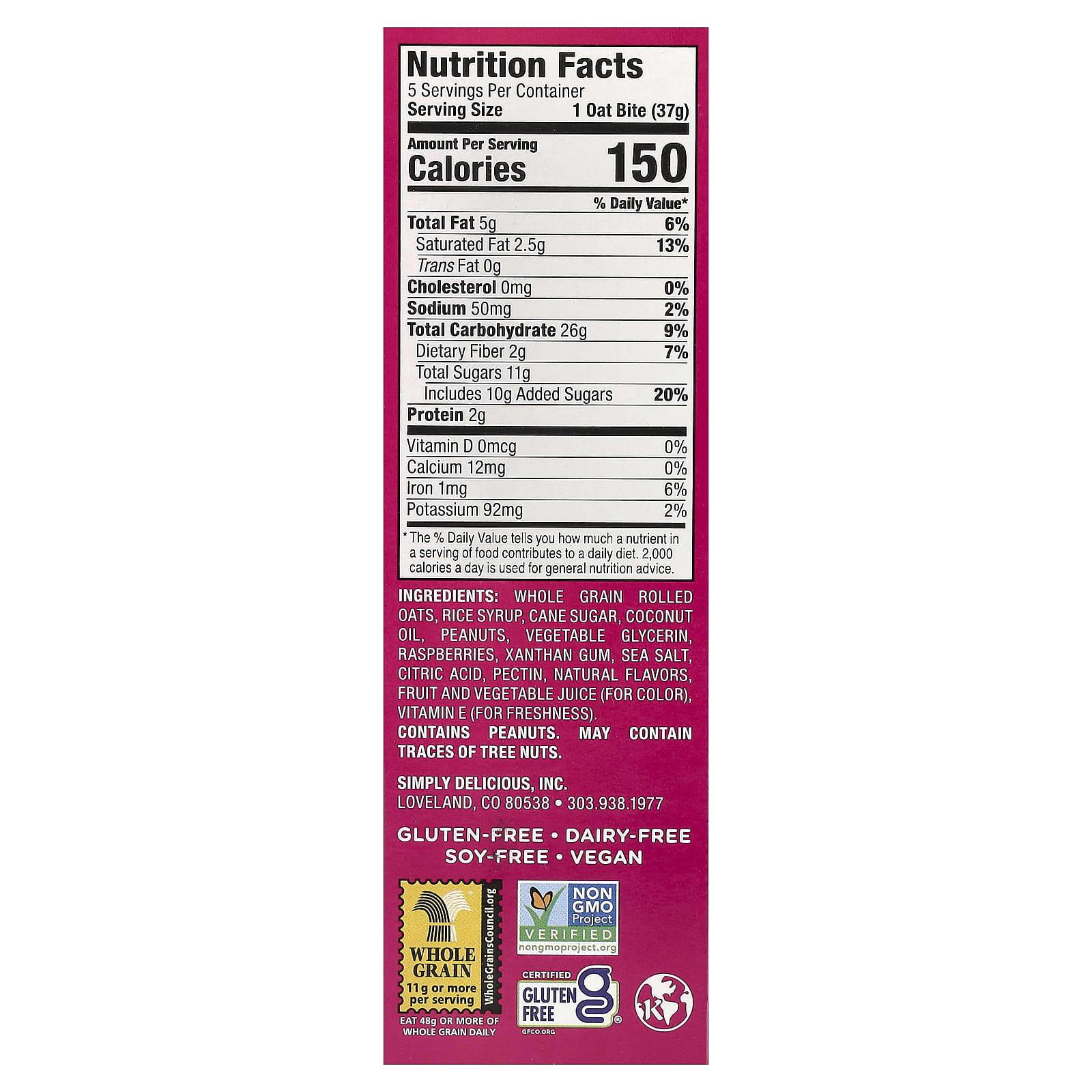 Цельнозерновой плющенный овес, рисовый сироп, тростниковый сахар, кокосовое масло, Арахис, растительный глицерин, малины, Ксантановая камедь, морская соль, лимонная кислота, пектин, натуральные ароматизаторы, фруктовый и овощной соки (в качестве красителей), витамин E (для свежести).