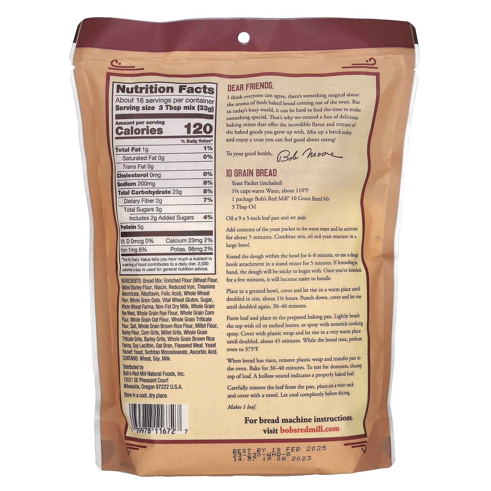 Хлебная смесь: мука обогащенная (пшеничная мука, солодовая ячменная мука, ниацин, восстановленное железо, тиамина мононитрат, рибофлавин, фолиевая кислота), цельнозерновая пшеничная мука, цельнозерновой овес, живой пшеничный глютен, сахара, цельнозерновой фарина, обезжиренное сухое молоко, цельнозерновая ржаная мука, цельнозерновая ржаная мука, цельнозерновая кукурузная мука, цельнозерновая овсяная мука, цельнозерновая мука из тритикале, соль, цельнозерновая мука из коричневого риса, пшенная мука, ячменная мука, мука из белой фасоли, кукурузная крупа, пшенная крупа, цельнозерновая крупа тритикале, ячменная крупа, цельнозерновой коричневый рис, соевый лецитин, овсяные отруби, льняная мука. Пакетик дрожжей: дрожжи, сорбитан моностеарат, аскорбиновая кислота.