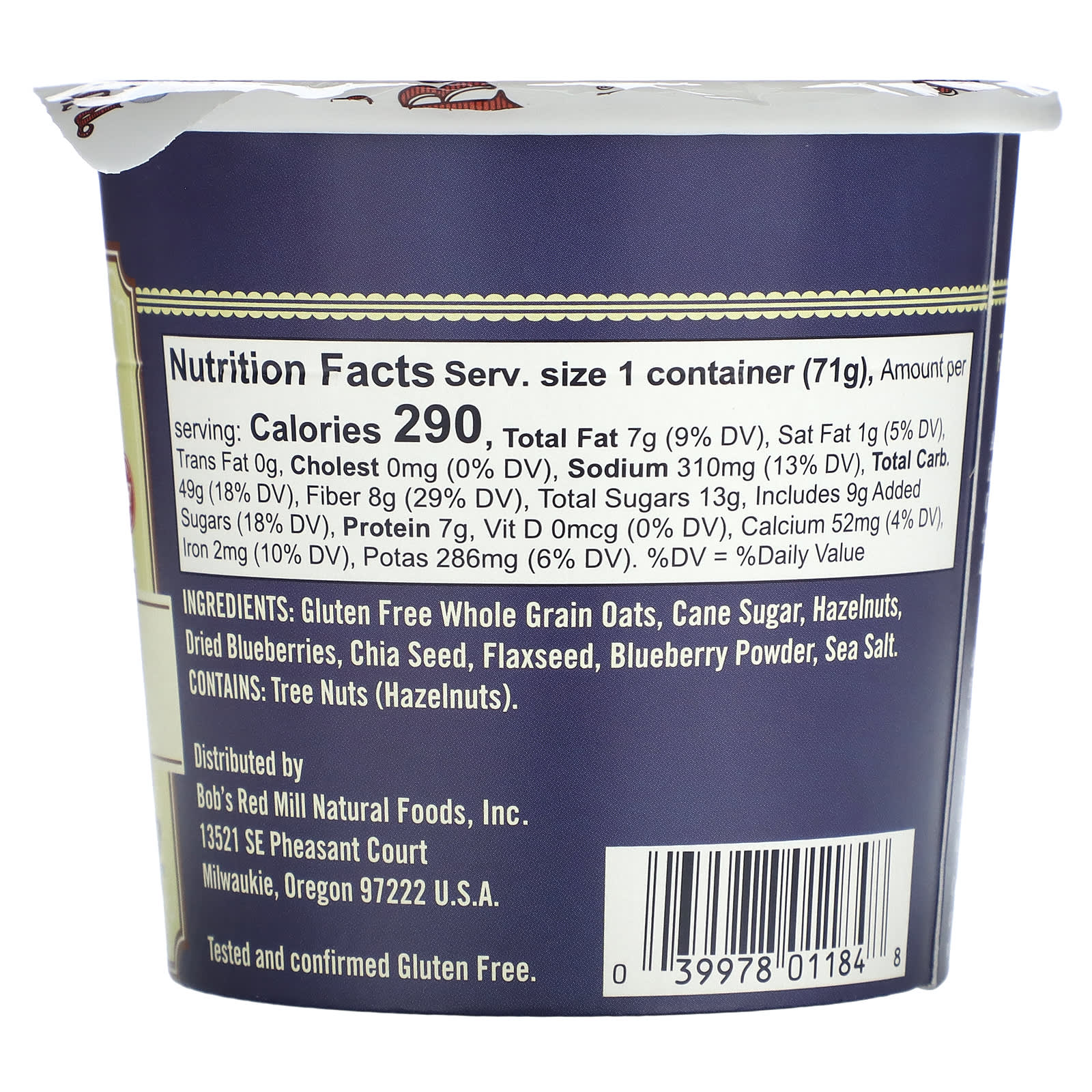 Без клейковин цельного зерна овса, тростникового сахара, фундука, сушеных черники, семян чиа, льняного семени, порошка черники, морской соли.