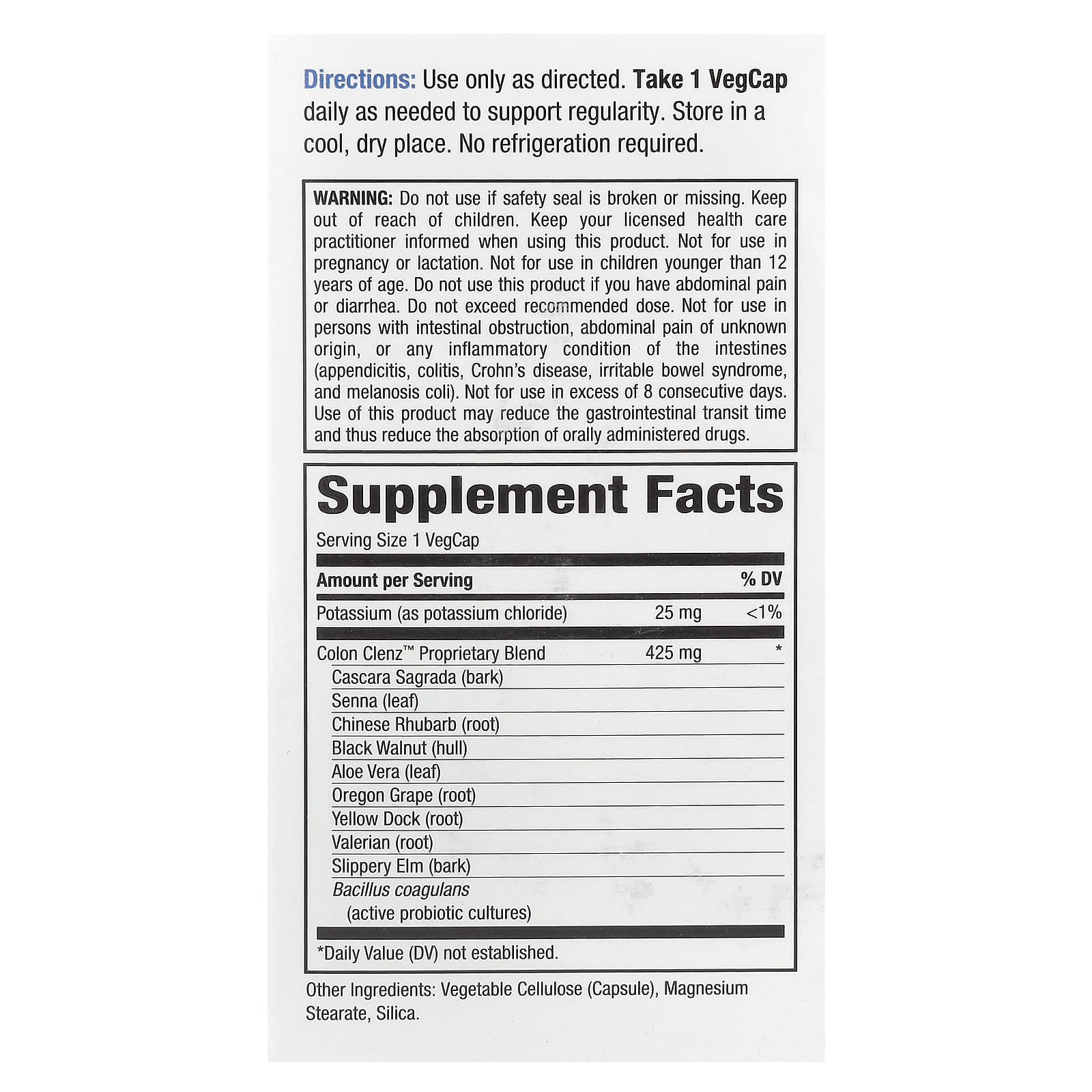 Применять только согласно инструкции. Принимать 1 капсулу VegCap в день по мере необходимости для поддержания регулярного стула.