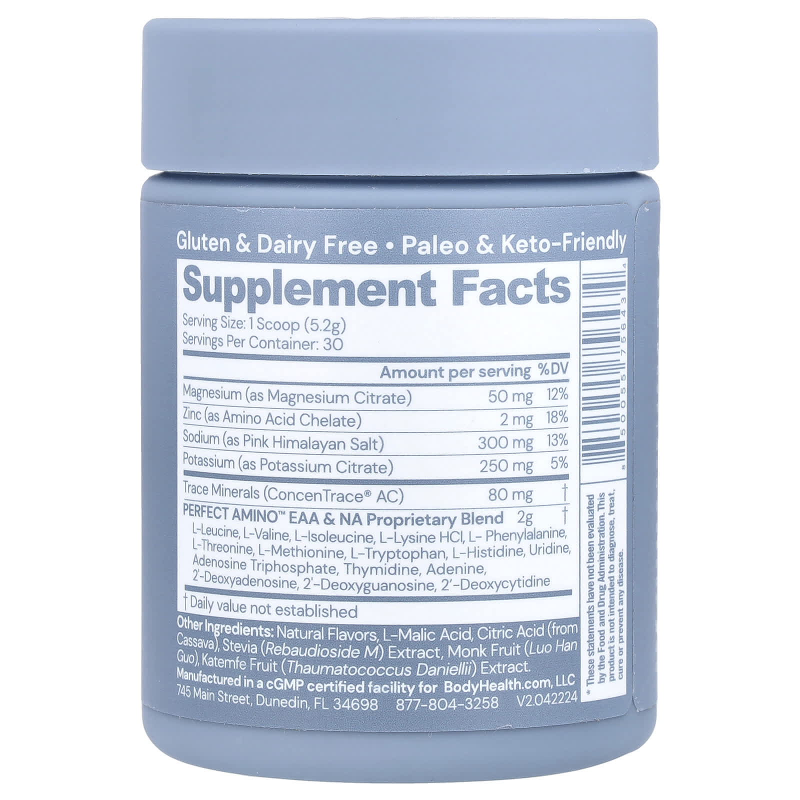 Точный состав электролитов PERFECT AMINO ™ содержит смесь ключевых минералов и электролитов, включая магний, цинк, натрий и калий, а также 68 дополнительных микроэлементов и аминокислот в ионной форме. Он предназначен для восстановления того, что было утрачено в результате физической активности, и способствует оптимальному увлажнению и быстрому восстановлению.