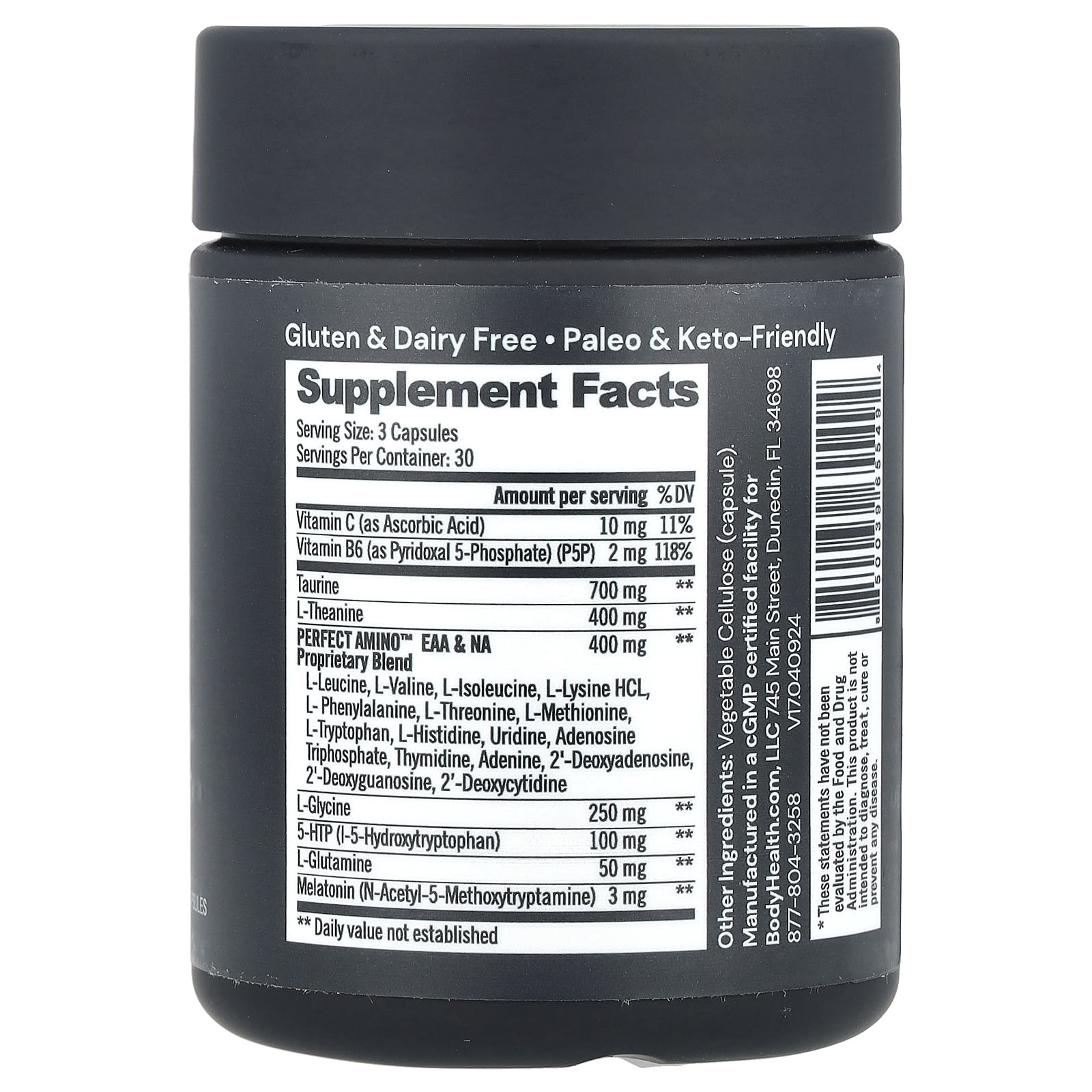 | Запатентованная смесь PerfectAmino® EAA и NA L-лейцин, L-валин, L-изолейцин, L-лизин гидрохлорид, L-фенилаланин, L-треонин, L-метионин, L-триптофан, L-гистидин, уридин, аденозинтрифосфат, тимидин, аденин, 2'-дезоксиаденозин, 2'-дезоксигуанозин, 2'-дезоксицитидин | 400 мг | ** |