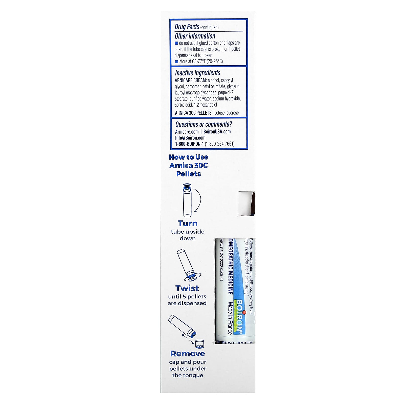 | Неактивные ингредиенты Крем с арникой: Спирт, каприлилгликоль, карбомер, цетилпальмитат, глицерин, лауроил макроголглицериды, пегоксол-7 стеарат, очищенная вода, гидроксид натрия, сорбиновая кислота, 1,2-гександиол. Пеллеты с арникой 30C: Лактоза, сахароза | |