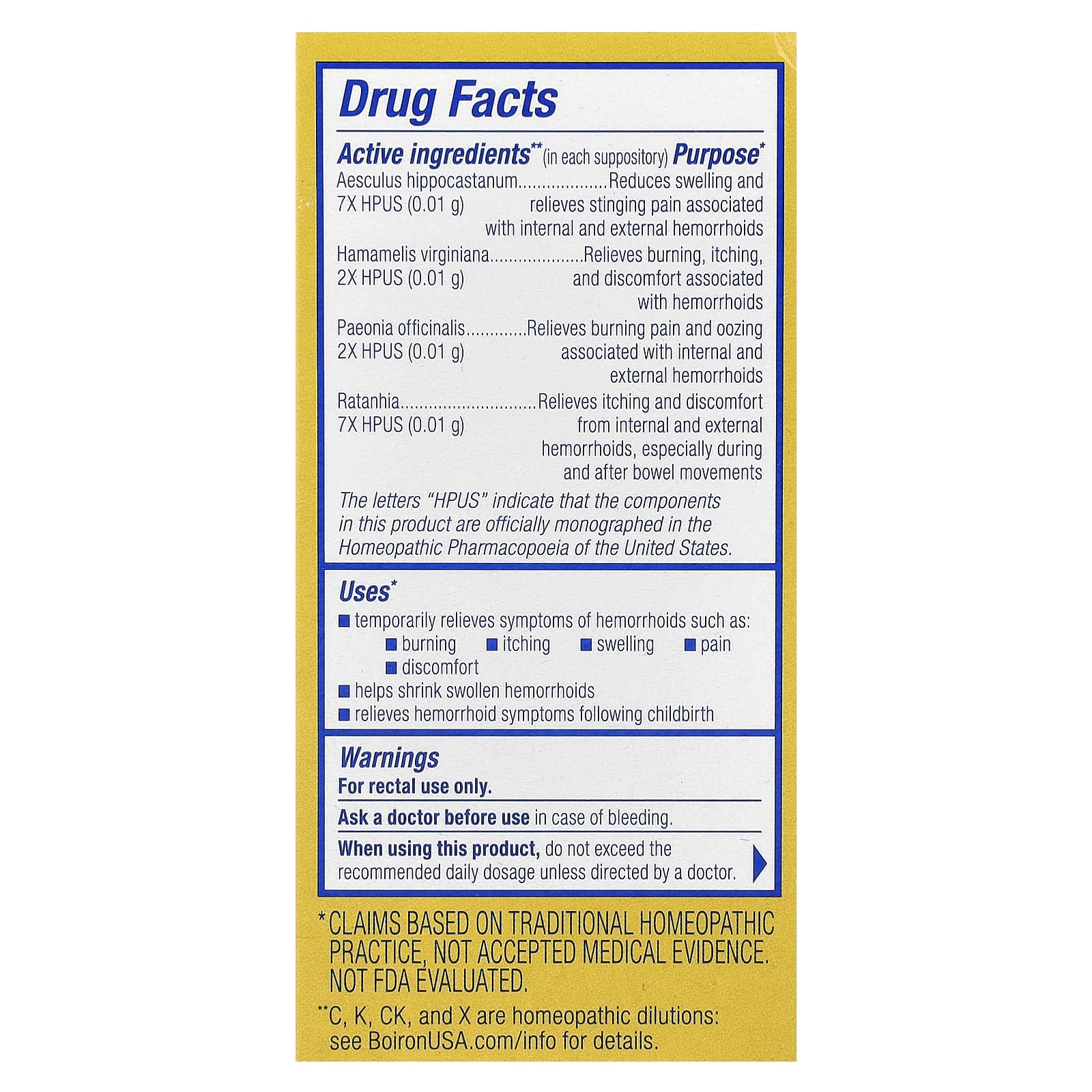 | Гамамелис виргинский, 2X HPUS (0,01 г) | Снимает жжение, зуд и дискомфорт, связанные с геморроем |